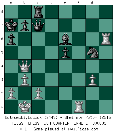 Last move : 0-1 2007 September 3 6:4:28 [Event "FICGS__CHESS__WCH_QUARTER_FINAL_1__000003"] [Site "FICGS"] [Date "2007.07.11"] [Round "6"] [White "Ostrowski,Leszek"] [Black "Shwimmer,Peter"] [Result "0-1"] [WhiteElo "2449"] [BlackElo "2516"] 1.e4 c5 2.Nf3 d6 3.d4 cxd4 4.Nxd4 Nf6 5.Nc3 a6 6.Bg5 e6 7.f4 Qb6 8.Nb3 Be7 9.Qf3 Nbd7 10.O-O-O Qc7 11.Qg3 h6 12.Bxf6 Bxf6 13.e5 dxe5 14.Ne4 exf4 15.Nxf6+ gxf6 16.Qg7 Rf8 17.Bd3 Ke7 18.Rhe1 Ne5 19.Nd4 Bd7 20.Kb1 Rh8 21.Bg6 Raf8 22.Bxf7 Nxf7 23.Nf5+ Kd8 24.Qxf6+ Kc8 25.Ne7+ Kb8 26.Ng6 Bc8 27.g3 fxg3 28.hxg3 e5 29.Nxf8 Rxf8 30.Rf1 Bh3 31.Rf2 Ka7 32.b3 Qc3 33.Rh1 Be6 34.Qe7 Qc8 35.Rhf1 Re8 36.Qb4 Qc7 37.Rf6 Ng5 38.Rxh6 Rc8 0-1 Sicilian : Najdorf, 7...Qb6 Queenside Castling by player White (move 10) Player Black won this chess game. Follow this game move after move (download)A chess genius has died; a loss for humanity. (Viktor Kortchnoi, about Bobby Fischer's death) Er war ein guter Schachspieler, aber ich kann Leute nicht ausstehen, die 'Heil Hitler' rufen (Über Alexander Aljechin). (Miguel Najdorf) El Ajedrez es el juego mas altamente simbólico, pero las agresiones estan por lo tanto aún mas francamente representadas en la partida. Tal vez comenzo como un juego de guerra; Algo como la representación de una batalla en miniatura entre las fuerzas de dos reinos. (Karl Meninger) La guerre est enfant de la passion, la passion est enfant du narcissisme et le narcissisme est l'enfant. (...) Une autre partie ? (Thibault de Vassal) Once you start thinking you have nothing left to learn, you have everything to learn. (Steve Badget)