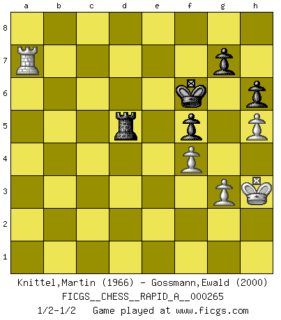 Last move : 1/2-1/2 2021 May 8 11:58:37 [Event "FICGS__CHESS__RAPID_A__000265"] [Site "FICGS"] [Date "2021.01.23"] [Round "1"] [White "Knittel,Martin"] [Black "Gossmann,Ewald"] [Result "1/2-1/2"] [WhiteElo "1966"] [BlackElo "2000"] 1.e4 e5 2.Nf3 Nf6 3.Nxe5 d6 4.Nf3 Nxe4 5.d4 d5 6.Bd3 Be7 7.O-O Bf5 8.Re1 O-O 9.c4 Nc6 10.cxd5 Qxd5 11.Nc3 Nxc3 12.bxc3 Rae8 13.Bf4 Bxd3 14.Qxd3 Bd6 15.Ng5 f5 16.Bxd6 cxd6 17.h4 h6 18.Nh3 Re4 19.Qd2 Ne5 20.Nf4 Rxf4 21.Qxf4 Nd3 22.Qg3 Nxe1 23.Rxe1 Rf6 24.Re7 Rf7 25.Re2 Rf6 26.Re7 Rf7 27.Re8+ Rf8 28.Re2 Rf6 29.Qe3 Kh7 30.a4 Qc6 31.a5 Qa4 32.Qf3 Rf7 33.Re6 Qa1+ 34.Kh2 Qxa5 35.Qg3 Qd8 36.Rxd6 Qc7 37.Rd5 b6 38.Re5 a5 39.Qd3 a4 40.g3 Qd6 41.c4 Kh8 42.Qe3 Qc6 43.c5 bxc5 44.dxc5 Rf8 45.Re6 Qd5 46.Re7 Qc6 47.Qc3 Qf6 48.Qxf6 Rxf6 49.Ra7 Rc6 50.Rxa4 Rxc5 51.h5 Kg8 52.Ra7 Rb5 53.Kg2 Rd5 54.Kf3 Rb5 55.Re7 Ra5 56.Rb7 Rd5 57.Kf4 Ra5 58.Re7 Ra2 59.Kf3 Ra3+ 60.Kg2 Ra5 61.Kf3 Rb5 62.Kg2 Ra5 63.Rc7 Rb5 64.Kf3 Ra5 65.Rb7 Ra3+ 66.Kg2 Ra5 67.Rc7 Rb5 68.Kf3 Ra5 69.Rd7 Ra3+ 70.Kg2 Ra5 71.Rb7 Rc5 72.Ra7 Rb5 73.f4 Rb2+ 74.Kh3 Rb5 75.Rd7 Rc5 76.Rd8+ Kf7 77.Ra8 Rb5 78.Ra7+ Kf6 79.Ra6+ Kf7 80.Ra1 Kf6 81.Ra7 Rc5 82.Kg2 Rc2+ 83.Kh3 Rc5 84.Ra6+ Kf7 85.Ra8 Rb5 86.Ra7+ Kf6 87.Ra3 Rd5 88.Ra6+ Kf7 89.Ra7+ Kf6 1/2-1/2 Petrov : Classical attack Kingside Castling by player White (move 7) Kingside Castling by player Black (move 8) 10 pieces endgame at move 50 : White KRPPP , Black KRPPP WHITE : King + 1 Rook 3 Pawns BLACK : King + 1 Rook 3 Pawns This chess game ended in a draw. Follow this game move after move (download)When you play Bobby, it is not a question if you win or lose. It is a question if you survive. (Boris Spassky) Weshalb minderdergeübte Spieler mit g2-g4 beginnen? Die betreffenden sind unschlüssig, ob sie nun rechts (h4) oder links (f4) beginnen sollen, und in ihrer Ratlosigkeit entschliessen sie sich nach guter Bürgerart dazu, den goldenen Mittelweg zu wählen. (Aaron Nimzowitsch) En el Ajedrez, cuando menos, el valiente hereda la tierra. (Edmar Mednis) Un footballeur joue avec ses pieds, parfois avec sa tête. Un joueur d'échecs ne joue qu'avec sa tête. Et quand il ne joue plus, il meurt. (Jacob Murray) A person who never made a mistake never tried anything new. (Albert Einstein)