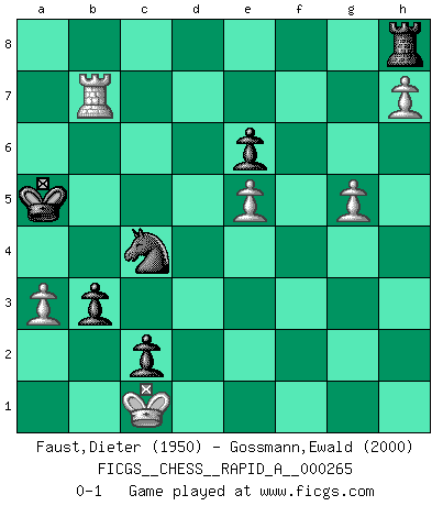 Last move : 0-1 2021 March 26 13:35:48 [Event "FICGS__CHESS__RAPID_A__000265"] [Site "FICGS"] [Date "2021.01.23"] [Round "1"] [White "Faust,Dieter"] [Black "Gossmann,Ewald"] [Result "0-1"] [WhiteElo "1950"] [BlackElo "2000"] 1.d4 d5 2.c4 c6 3.Nf3 Nf6 4.Nc3 e6 5.Bg5 h6 6.Bh4 dxc4 7.e4 g5 8.Bg3 b5 9.h4 g4 10.Ne5 Bg7 11.Nxg4 Nxg4 12.Qxg4 Bxd4 13.O-O-O Qb6 14.Bd6 Nd7 15.e5 Bxc3 16.Qg7 Bxb2+ 17.Kxb2 Rf8 18.Bxf8 Nxf8 19.Qxh6 Qxf2+ 20.Qd2 Qxd2+ 21.Rxd2 Nd7 22.h5 Ke7 23.h6 Bb7 24.Rh5 c5 25.g3 Bd5 26.Bg2 Nb6 27.Bxd5 Nxd5 28.Rf2 c3+ 29.Kb1 Nb4 30.Rf1 Rd8 31.a3 Nd5 32.Rf3 Rh8 33.g4 b4 34.g5 b3 35.Rh4 a6 36.h7 a5 37.Rg3 a4 38.Kc1 Kd7 39.Rgh3 Kc6 40.Rxa4 Kb5 41.Rah4 c4 42.Rf3 c2 43.Rxf7 Ne3 44.Rb7+ Ka5 45.Rxc4 Nxc4 0-1 QGD Slav : 4.Nc3 Queenside Castling by player White (move 13) Player Black won this chess game. Follow this game move after move (download)The tactician must know what to do whenever something needs doing; the strategist must know what to do when nothing needs doing. (Savielly Tartakover) Sie führen leise Selbstgespräche, schlürfen lautstark ihre Getränke, schmatzen hörbar beim Essen, blasen ihrem Gegenüber Rauch in die Augen, niesen ihm ins Gesicht, starren ihn unverwandt an, bis er sich unter ihren Blicken windet, rutschen ständig auf ihrem Stuhl hin und her, rülpsen und bohren in der Nase. (Anonymous) La belleza de un movimiento no se refleja solo en su apariencia, sino en el pensamiento detrás de él. (Siegbert Tarrasch) Je ne suis pas le dernier à jouer lâchement des coups douteux pendant le zeïtnot de l'adversaire pour l'achever: en effet les coups qui font le plus peur sont ceux que l'on ne comprend pas. Je me fais souvent peur quand je joue. (Un professeur anonyme) Chess is as much a mystery as women. (Purdy)
