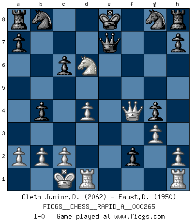Last move : 1-0 2021 February 19 13:4:42 [Event "FICGS__CHESS__RAPID_A__000265"] [Site "FICGS"] [Date "2021.01.23"] [Round "1"] [White "Cleto Junior,Dirceu"] [Black "Faust,Dieter"] [Result "1-0"] [WhiteElo "2062"] [BlackElo "1950"] 1.e4 e5 2.f4 exf4 3.Nf3 d6 4.Nc3 g5 5.d4 Bg7 6.g3 g4 7.Nh4 f3 8.Be3 Nf6 9.Qd2 c6 10.O-O-O b5 11.Bd3 b4 12.Na4 d5 13.Bh6 Bxh6 14.Qxh6 dxe4 15.Nc5 Ng8 16.Qe3 f5 17.Nxf5 Bxf5 18.Bxe4 Qe7 19.Qf4 Bxe4 20.Nxe4 f2 21.Nd6+ 1-0 KGA : Fischer defense Queenside Castling by player White (move 10) Player White won this chess game. Follow this game move after move (download)Though most people love to look at the games of the great attacking masters, some of the most successful players in history have been the quiet positional players. They slowly grind you down by taking away your space, tying up your pieces, and leaving you with virtually nothing to do ! (Yasser Seirawan) Nicht daß Diemer aus Opportunismus Mitglied der NSDAP geworden wäre. Er war ein Fanatiker, in allem, was er tat. (Hans Ree) La esencia del Ajedrez es pensar acerca de lo que el Ajedrez es. (David Bronstein) Le succès, c'est être capable d'aller d'échec en échec sans perdre son enthousiasme. (Winston Churchill) Wisdom doesn't necessarily come with age. Sometimes age just shows up all by itself. (Tom Wilson)