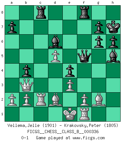Last move : 0-1 2021 February 27 11:30:20 [Event "FICGS__CHESS__CLASS_B__000336"] [Site "FICGS"] [Date "2021.01.26"] [Round "1"] [White "Vellema,Jelle"] [Black "Krakovsky,Peter"] [Result "0-1"] [WhiteElo "1901"] [BlackElo "1805"] 1.d4 d5 2.Nf3 Nf6 3.e3 c6 4.Nbd2 Bf5 5.Ne5 Nbd7 6.g4 Be6 7.g5 Ne4 8.Nxe4 dxe4 9.Nxd7 Qxd7 10.c4 h6 11.g6 fxg6 12.Rg1 Bf5 13.Qb3 e5 14.d5 Bc5 15.Bd2 O-O 16.Bc3 cxd5 17.cxd5 Kh7 18.Bxe5 Rac8 19.Bc3 Bd6 20.Rd1 Bxh2 21.Rh1 Bd6 22.Rd2 Bg4 23.Bg2 b5 24.Rc2 b4 25.Bd2 Qf5 26.Rf1 Bh5 0-1 Queen's pawn game Kingside Castling by player Black (move 15) Player Black won this chess game. Follow this game move after move (download)The game of chess is the touchstone of the intellect. (Goethe) Man kann eine Schachpartie nur gewinnen, wenn das Gleichgewicht gestört ist. In einer Stellung mit ungestörtem Gleichgewicht ist auch das größte Genie hilflos - in der Stellung steckt dann eben kein genialer Einfall. (Wilhelm Steinitz) Nunca antes ha habido un jugador de Ajedrez con tal conocimiento a fondo de las complejidades del juego y una inmensa voluntad absolutamente indomable de ganar. Yo pienso que Fischer es el jugador mas grande que jamás haya existido. (Lisa Lane) J'apprécie les joueurs d'est-indienne, c'est grâce à eux que je nourris ma famille depuis tant d'années. (Petrosian) Before all elsed, be armed. (Niccolo Machiavelli)