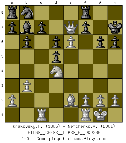 Last move : 1-0 2021 February 12 19:40:0 [Event "FICGS__CHESS__CLASS_B__000336"] [Site "FICGS"] [Date "2021.01.26"] [Round "1"] [White "Krakovsky,Peter"] [Black "Nemchenko,Valery"] [Result "1-0"] [WhiteElo "1805"] [BlackElo "2001"] 1.e4 d6 2.d4 Nf6 3.Nc3 g6 4.Nf3 Bg7 5.Be2 O-O 6.O-O e6 7.Be3 b6 8.Qd2 Bb7 9.Bg5 Qd7 10.e5 Ne4 11.Nxe4 Bxe4 12.Qf4 Bxc2 13.Rac1 Ba4 14.Bf6 h6 15.d5 exd5 16.b3 Bc6 17.Bxg7 Kxg7 18.Qf6+ Kh7 19.Nd4 Bb7 20.e6 Qe7 21.Qxe7 1-0 Pirc : Classical system, 5.Be2 Kingside Castling by player Black (move 5) Kingside Castling by player White (move 6) Player White won this chess game. Follow this game move after move (download)Chess is imagination. (David Bronstein) Sicherlich können nur Meister einen Stil haben. Daß ein nicht-Meister auch nur ein einziges Mal in seinem Leben eine Partie folgerecht durchführte, habe ich niemals bemerkt. (Emanuel Lasker) Ciertamente, de todas la drogas del mundo, el Ajedrez debe ser el mas placentero permamentemente. (Assiac) Roi des jeux et jeu des rois, les échecs portent en eux un sentiment d'infini. Ils donnent à celui qui s'est efforcé d'en approfondir les arcanes l'impression de n'être pas à la mesure de l'homme; en fait, ils constituent un résumé de l'univers, un microcosme, et figurent cette grande échelle qui, dans les plans de la lumière descend jusqu'à la matière, qui des abîmes insondables remonte jusqu'en l'infini de Dieu. (Pyrame) There are two kinds of people in the world, my friend. Those who have a loaded gun and those who dig. You dig ! (Blondie in The Good, The Bad and The Ugly)