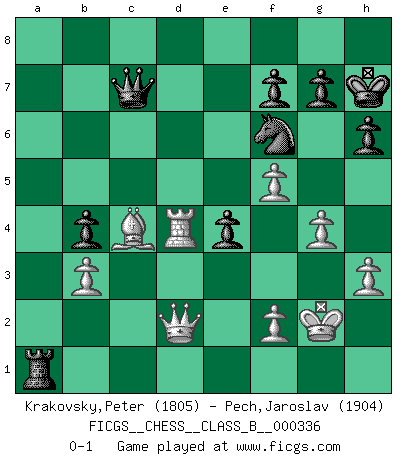 Last move : 0-1 2021 December 31 1:38:42 [Event "FICGS__CHESS__CLASS_B__000336"] [Site "FICGS"] [Date "2021.01.26"] [Round "1"] [White "Krakovsky,Peter"] [Black "Pech,Jaroslav"] [Result "0-1"] [WhiteElo "1805"] [BlackElo "1904"] 1.e4 e5 2.Nf3 Nc6 3.Bb5 a6 4.Ba4 Nf6 5.O-O Be7 6.Re1 b5 7.Bb3 d6 8.c3 O-O 9.h3 Na5 10.Bc2 c5 11.d4 Qc7 12.Nbd2 cxd4 13.cxd4 Nc6 14.Nb3 a5 15.Be3 a4 16.Nbd2 Bd7 17.Rc1 Qb7 18.Nf1 Rfc8 19.Ng3 Bd8 20.Qe2 Bb6 21.dxe5 Nxe5 22.Nxe5 dxe5 23.Nf5 Bxf5 24.exf5 Bxe3 25.Qxe3 Re8 26.Bd3 e4 27.Bf1 b4 28.Rc5 Red8 29.Rb5 Qe7 30.Bc4 Rab8 31.Rxb8 Rxb8 32.g4 h6 33.Rd1 Rc8 34.Rd4 Kh7 35.Kf1 Qc7 36.Kg2 Qa7 37.b3 axb3 38.axb3 Ra8 39.Be2 Qc5 40.Bc4 Qc7 41.Qd2 Ra1 0-1 Ruy Lopez : Closed Kingside Castling by player White (move 5) Kingside Castling by player Black (move 8) Player Black won this chess game. Follow this game move after move (download)All Chess players should have a hobby. (Savielly Tartakower) Wenn ich gewinne bin ich ein Genie. Wenn nicht, dann bin ich keines. (Robert James Fischer) Hoy en día, si tu no eres un Gran Maestro a los 14 años, es mejor que lo olvides. (Anand Viswanathan) La conception d'un plan est le processus par lequel un joueur exploite les avantages de sa position tout en s'efforçant d'en réduire au minimum les inconvénients. Afin de garantir le succès, un plan doit toujours se fonder sur un diagnostic objectif des particularités d'une position. La conception d'un plan est d'autant plus difficile que la position est équilibrée, et grandement facilitée lorsqu'il n'existe qu'un seul plan susceptible de répondre aux exigences de la position. (Harry Golombek) There are 10 types of people in this world: those who understand binary and those who don't. (Anonymous)