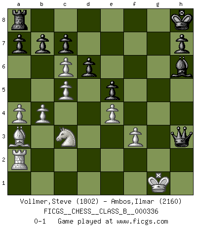 Last move : 0-1 2021 February 3 21:46:34 [Event "FICGS__CHESS__CLASS_B__000336"] [Site "FICGS"] [Date "2021.01.26"] [Round "1"] [White "Vollmer,Steve"] [Black "Ambos,Ilmar"] [Result "0-1"] [WhiteElo "1802"] [BlackElo "2160"] 1.d4 Nf6 2.c4 g6 3.f3 Bg7 4.e4 d6 5.Bd3 O-O 6.Ne2 e5 7.d5 Nh5 8.O-O f5 9.Nbc3 f4 10.b4 g5 11.c5 g4 12.Qe1 Kh8 13.a4 gxf3 14.gxf3 Bh3 15.Ba3 Qg5+ 16.Ng3 fxg3 17.Ra2 gxh2+ 18.Kxh2 Nf4 19.Bc4 Qh5 20.Kg1 Qg5+ 21.Kh2 Bxf1 22.Bxf1 Rf6 23.Bg2 Rg6 24.Qf1 Nc6 25.dxc6 Qg3+ 26.Kg1 Nh3+ 27.Kh1 Rh6 28.Bxh3 Rxh3+ 29.Qxh3 Qxh3+ 30.Kg1 Bh6 0-1 King's Indian defense Kingside Castling by player Black (move 5) Kingside Castling by player White (move 8) Player Black won this chess game. Follow this game move after move (download)The Chess pieces are the block alphabet which shapes thoughts; and these thoughts, although making a visual design on the chessboard, express their beauty abstractly, like a poem. (Marcel Duchamp) Aljechin war kein Nazi. Er war ein Opportunist. Ein schrecklicher Mann. Er liebte Geld über alles und würde für Geld ein Jude, ein Katolik oder ein Protestant werden. (Miguel Najdorf) Una clavada es mas poderosa que una espada. (Fred Reinfeld) Karpov est une pièce de musée. (Garry Kasparov) At last I discovered the true beauty of chess. So I proposed to her. (Dinesh De Silva)