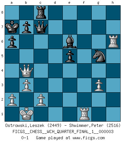 Last move : 0-1 2007 September 3 6:3:43 [Event "FICGS__CHESS__WCH_QUARTER_FINAL_1__000003"] [Site "FICGS"] [Date "2007.07.11"] [Round "8"] [White "Ostrowski,Leszek"] [Black "Shwimmer,Peter"] [Result "0-1"] [WhiteElo "2449"] [BlackElo "2516"] 1.e4 c5 2.Nf3 d6 3.d4 cxd4 4.Nxd4 Nf6 5.Nc3 a6 6.Bg5 e6 7.f4 Qb6 8.Nb3 Be7 9.Qf3 Nbd7 10.O-O-O Qc7 11.Qg3 h6 12.Bxf6 Bxf6 13.e5 dxe5 14.Ne4 exf4 15.Nxf6+ gxf6 16.Qg7 Rf8 17.Bd3 Ke7 18.Rhe1 Ne5 19.Nd4 Bd7 20.Kb1 Rh8 21.Bg6 Raf8 22.Bxf7 Nxf7 23.Nf5+ Kd8 24.Qxf6+ Kc8 25.Ne7+ Kb8 26.Ng6 Bc8 27.g3 fxg3 28.hxg3 e5 29.Nxf8 Rxf8 30.Rf1 Bh3 31.Rf2 Ka7 32.b3 Qc3 33.Rh1 Be6 34.Qe7 Qc8 35.Rhf1 Re8 36.Qb4 Qc7 37.Rf6 Ng5 38.Rxh6 Rc8 0-1 Sicilian : Najdorf, 7...Qb6 Queenside Castling by player White (move 10) Player Black won this chess game. Follow this game move after move (download)The beauty of a move lies not in its' appearance but in the thought behind it. (Siegbert Tarrasch) Es ist peinlich, dass ich nie Weltmeister wurde. Es wäre leicht, Leonid Breschnjew als Ursache vorzuschieben, dessen Apparat den Vorzeigekommunisten Anatoli Karpow in allem unterstützte. Aber Garri Kasparow zum Beispiel, der ebenfalls von den Sowjets unerwünscht war, hat trotz der Widerstände den WM-Titel erobert. (Viktor Kortschnoi) Fischer es el jugador mas fuerte del mundo. De hecho, el jugador mas fuerte que jamas haya existido. (Larry Evans) Le profane ne songe pas à la somme de jouissance dont il se prive, qui méconnaît ce jeu aux ressources aussi variées que passionnantes. (Jean-Marie Jeanton-Lamarche) If you don't practice you don't deserve to win. (Andre Agassi)