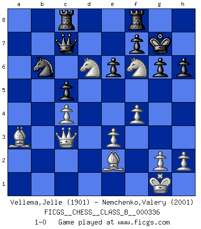 Last move : 1-0 2021 February 15 15:51:57 [Event "FICGS__CHESS__CLASS_B__000336"] [Site "FICGS"] [Date "2021.01.26"] [Round "1"] [White "Vellema,Jelle"] [Black "Nemchenko,Valery"] [Result "1-0"] [WhiteElo "1901"] [BlackElo "2001"] 1.d4 Nf6 2.Nf3 g6 3.e3 Bg7 4.Be2 O-O 5.O-O e6 6.b4 a6 7.Bb2 b6 8.a4 Bb7 9.c4 d6 10.Nc3 Nbd7 11.Qc2 Rc8 12.Rfd1 Qe7 13.Ba3 c5 14.dxc5 bxc5 15.b5 Nb6 16.Rab1 axb5 17.Rxb5 Nfd7 18.a5 Bc6 19.axb6 Bxb5 20.Nxb5 Nxb6 21.Rxd6 Qb7 22.Ng5 h6 23.Ne4 Be5 24.f4 Bxd6 25.Nf6+ Kg7 26.Nxd6 Qc7 27.Qc3 1-0 King's Indian : East Indian defense Kingside Castling by player Black (move 4) Kingside Castling by player White (move 5) Player White won this chess game. Follow this game move after move (download)Your body has to be in top condition. Your Chess deteriorates as your body does. You can't separate body from mind. (Bobby Fischer) In der Schule lernt man nichts. Es ist nur Zeitverschwendung. (Robert James Fischer) Cuando tu no sabes absolutamente que mas hacer, es tiempo de entrar en pánico. (John van der Wiel) Les Cavaliers se révèlent fort utiles dans les positions fermées. D'habitude, les Fous sont un peu plus forts que les Cavaliers dans les positions ouvertes. Qu'on le veuille ou non, il restera toujours des exceptions ! No, no, you're not thinking; you're just being logical. (Niels Bohr)