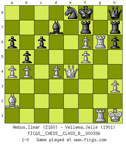 Last move : 1-0 2021 July 28 13:26:56 [Event "FICGS__CHESS__CLASS_B__000336"] [Site "FICGS"] [Date "2021.01.26"] [Round "1"] [White "Ambos,Ilmar"] [Black "Vellema,Jelle"] [Result "1-0"] [WhiteElo "2160"] [BlackElo "1901"] 1.d4 Nf6 2.c4 e6 3.Nf3 d5 4.Nc3 c6 5.Bg5 Nbd7 6.e3 Be7 7.Bd3 O-O 8.O-O a6 9.cxd5 exd5 10.Qc2 Re8 11.h3 Nf8 12.Rae1 h6 13.Bf4 Bd6 14.Bxd6 Qxd6 15.a3 Be6 16.Rc1 Rad8 17.b4 Bc8 18.Rb1 Re7 19.a4 Rde8 20.Rfc1 Ne6 21.Ne2 Bd7 22.Ne5 Ra8 23.f4 Nf8 24.Ng3 Rae8 25.Qb2 Ra8 26.Rc3 g6 27.Qf2 Rae8 28.Nf1 Ne6 29.g4 Nc7 30.Rc2 Bc8 31.Ng3 Nd7 32.Kh1 Qf6 33.Rg1 Rd8 34.Nf5 gxf5 35.gxf5 Kf8 36.Ng4 Qh8 37.Qh4 f6 38.Ne5 Nxe5 39.fxe5 Ne8 40.Rcg2 Rh7 41.Rg6 R8d7 42.exf6 Rdf7 43.e4 dxe4 44.Qxe4 b5 45.Bb1 Bd7 46.Ba2 1-0 Queen's pawn game Kingside Castling by player Black (move 7) Kingside Castling by player White (move 8) Player White won this chess game. Follow this game move after move (download)I have always a slight feeling of pity for the man who has no knowledge of Chess. (Siegbert Tarrasch) Obendrein hat der FIDE-Präsident den Revolutionsführer Gaddafi zum »Großmeister« ernannt, am Ende der WM. Das ist lächerlich! (Joel Lautier) Dios mío, Bobby Fischer juega tan simple. (Alexei Suetin) Un footballeur joue avec ses pieds, parfois avec sa tête. Un joueur d'échecs ne joue qu'avec sa tête. Et quand il ne joue plus, il meurt. (Jacob Murray) All battles are fought by scared men who'd rather be someplace else. (John Wayne in the movie In harm's way)