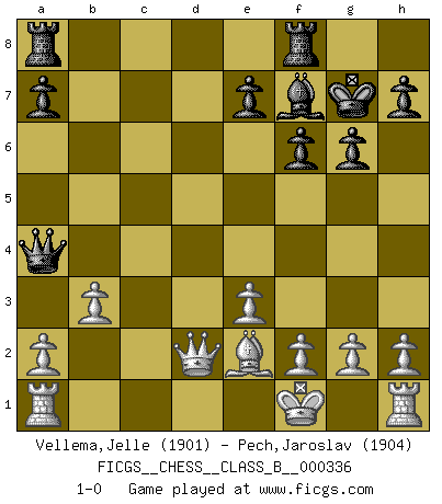 Last move : 1-0 2021 July 20 15:3:11 [Event "FICGS__CHESS__CLASS_B__000336"] [Site "FICGS"] [Date "2021.01.26"] [Round "1"] [White "Vellema,Jelle"] [Black "Pech,Jaroslav"] [Result "1-0"] [WhiteElo "1901"] [BlackElo "1904"] 1.d4 Nf6 2.Nf3 g6 3.e3 Bg7 4.Be2 d5 5.b4 O-O 6.Nbd2 b6 7.Bb2 c5 8.bxc5 bxc5 9.dxc5 Na6 10.Bd4 Ne4 11.Nb3 Naxc5 12.Nxc5 Qa5+ 13.Kf1 Nxc5 14.Bxg7 Kxg7 15.Qxd5 Be6 16.Qd4+ f6 17.Qd2 Qa4 18.Nd4 Bf7 19.Nb3 Nxb3 20.cxb3 1-0 This chess game has been lost on time (started : 2021.01.26 13:38:14) King's Indian : East Indian defense Kingside Castling by player Black (move 5) Player White won this chess game. Follow this game move after move (download)Tactics flow from a superior position. (Bobby Fischer) Schach ist gnadenlos. Du mußt bereit sein zu töten. (Nigel Short) No hay precio que no valga la pena por la cabellera del Rey enemigo. (Koblentz) Un millionnaire : 'Monsieur Steinitz ! Vous ne participez aux tournois que pour l'argent, alors que moi je n'y viens que pour l'honneur.' Steinitz : 'Chacun joue pour ce qu'il n'a pas'... There are three kinds of lies: lies, damned lies and statistics. (Mark Twain)