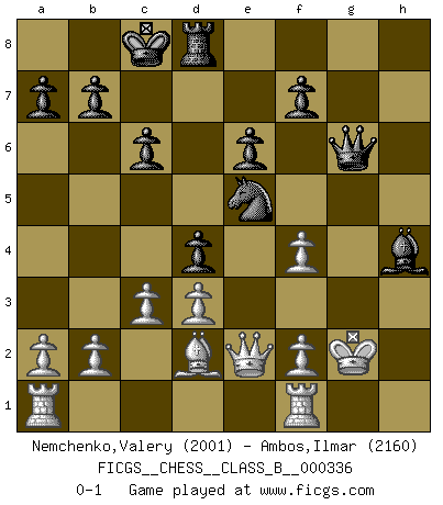 Last move : 0-1 2021 March 6 9:11:45 [Event "FICGS__CHESS__CLASS_B__000336"] [Site "FICGS"] [Date "2021.01.26"] [Round "1"] [White "Nemchenko,Valery"] [Black "Ambos,Ilmar"] [Result "0-1"] [WhiteElo "2001"] [BlackElo "2160"] 1.Nf3 Nf6 2.g3 d5 3.Bg2 c6 4.O-O Bf5 5.d3 e6 6.Nh4 Bg4 7.h3 Bh5 8.Bg5 h6 9.Bd2 Nbd7 10.Nc3 g5 11.Nf3 g4 12.hxg4 Bxg4 13.Nh4 Rg8 14.Bf3 d4 15.Ne4 Nxe4 16.Bxe4 Be7 17.Ng2 h5 18.c3 h4 19.gxh4 Bxh4 20.Bf3 Bxf3 21.exf3 Qf6 22.f4 O-O-O 23.Qf3 Ne5 24.Qe2 Rxg2+ 25.Kxg2 Qg6+ 0-1 Reti Opening Kingside Castling by player White (move 4) Queenside Castling by player Black (move 22) Player Black won this chess game. Follow this game move after move (download)A great player and a great example for many. His book My 60 Memorable Games had a big impact on me. It is a shame he didn't continue to enrich the world of chess with his unparalleled understanding after 1972. (Jan Timman, about Bobby Fischer's death) Als er Schachweltmeister wurde ließ er praktisch alle stärksten Sovietspieler für sich arbeiten. Wenn ein auch nur mittelmässiger Meister ein Spezialist für eine bestimmte Eröffnung war, wurde er von Karpov gerufen. Das wurde alles geheim gehalten. (Mikhail Moiseyevich Botvinik) Me siento como si fuera una pieza en una partida de Ajedrez, cuando mi oponente me indica: esa pieza no puede ser movida. (Soren Kierkegaard) A chaque perte on perd un peu de soi. (Joël Lautier) They misunderestimated me. (George W. Bush, Bentonville nov. 6, 2000)