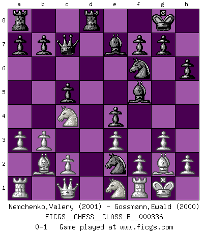 Last move : 0-1 2021 February 6 10:54:58 [Event "FICGS__CHESS__CLASS_B__000336"] [Site "FICGS"] [Date "2021.01.26"] [Round "1"] [White "Nemchenko,Valery"] [Black "Gossmann,Ewald"] [Result "0-1"] [WhiteElo "2001"] [BlackElo "2000"] 1.Nf3 d5 2.g3 c5 3.Bg2 Nf6 4.O-O e6 5.d3 Nc6 6.a3 Be7 7.b3 O-O 8.Bb2 Qc7 9.Nbd2 e5 10.Ng5 h6 11.Ngf3 e4 12.dxe4 dxe4 13.Ne1 Rd8 14.Qc1 Bf5 15.Nc4 Nd4 16.e3 Ne2+ 0-1 Reti : King's Indian attack Kingside Castling by player White (move 4) Kingside Castling by player Black (move 7) Player Black won this chess game. Follow this game move after move (download)Bobby just drops the pieces and they fall on the right squares. (Miguel Najdorf) Ivan Sokolov treibt mich als Beifahrer an mit go Loeky go - . (Loek van Wely) Un entendimiento minucioso de las típicas continuaciones de mate hacen de las mas complicadas combinaciones de sacrificio que conducen hacia ellas no solo no dificiles, sino casi un asunto de rutina. (Siegbert Tarrasch) Plusieurs personnes se sont demandées comment Tal faisait pour gagner... En fait, c'est très simple ! Il met ses pièces au centre de l'échiquier et les sacrifie quelque part ! (David Bronstein) Live, lose, and learn, by observing your opponent how to win. (Amber Steenbock)
