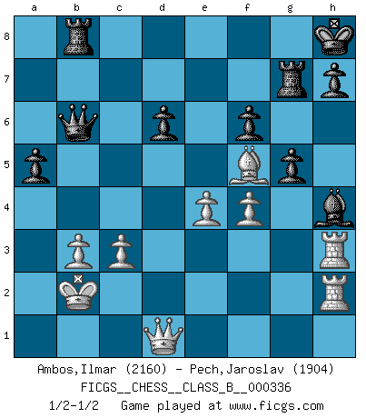 Last move : 1/2-1/2 2021 November 14 14:49:56 [Event "FICGS__CHESS__CLASS_B__000336"] [Site "FICGS"] [Date "2021.01.26"] [Round "1"] [White "Ambos,Ilmar"] [Black "Pech,Jaroslav"] [Result "1/2-1/2"] [WhiteElo "2160"] [BlackElo "1904"] 1.e4 c5 2.Nf3 Nc6 3.d4 cxd4 4.Nxd4 Nf6 5.Nc3 e5 6.Ndb5 d6 7.Bg5 a6 8.Na3 b5 9.Nd5 Be7 10.Bxf6 Bxf6 11.c3 O-O 12.Nc2 Bg5 13.a4 bxa4 14.Rxa4 a5 15.Bc4 Rb8 16.b3 Kh8 17.Nce3 g6 18.h4 Bxh4 19.g3 Bg5 20.f4 exf4 21.gxf4 Bh4+ 22.Kd2 Ne7 23.Qg1 Nxd5 24.Nxd5 Be6 25.Qh2 g5 26.Kc2 Bxd5 27.Bxd5 f6 28.Qh3 Qb6 29.Rd4 Rbc8 30.Kb2 Rc7 31.Rd2 Qc5 32.Rc1 Qb5 33.Rg2 Rg7 34.Rh1 Qd7 35.Qd3 Qa7 36.Qf3 Rc8 37.Be6 Rb8 38.Qd3 Qc5 39.Bd5 Qc7 40.Rhg1 Qa7 41.Qe2 Qc5 42.Rh1 Qc8 43.Qf3 Qd7 44.Qd3 Qc7 45.Rh3 Rc8 46.Be6 Re8 47.Bf5 Rb8 48.Qd5 Qb7 49.Qd1 Qb6 50.Rgh2 1/2-1/2 Sicilian : Pelikan (Lasker/Sveshnikov) variation Kingside Castling by player Black (move 11) This chess game ended in a draw. Follow this game move after move (download)You can only get good at Chess if you love the game. (Bobby Fischer) Man braucht nicht immer den besten Zug zu spielen: Ein Zug muß aktiv, unternehmungslustig, korrekt und schön sein. (David Bronstein) Robert Fischer es la ley hacia si mismo. (Larry Evans) Les échecs sont un jeu terrible. Si vous n'avez pas le centre, votre adversaire a une position plus libre. Par contre, si vous avez le centre, alors vous avez vraiment quelque chose pour laquelle vous inquiéter ! (Siegbert Tarrasch) A married woman is like a fish riding a bicycle. (Rodolfo d'Ettorre)