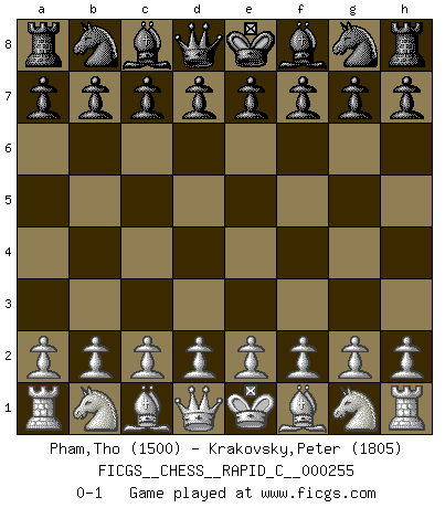 Last move : 0-1 2021 February 25 21:40:51 [Event "FICGS__CHESS__RAPID_C__000255"] [Site "FICGS"] [Date "2021.01.26"] [Round "1"] [White "Pham,Tho"] [Black "Krakovsky,Peter"] [Result "0-1"] [WhiteElo "1500"] [BlackElo "1805"] 0-1 This chess game has been lost on time (started : 2021.01.26 13:54:42) Player Black won this chess game. Follow this game move after move (download)When you see a good move, look for a better one. (Emanuel Lasker) Der Freibauer hat für mich eine Seele, genau wie der Mensch, Wünsche, die unerkannt in ihm schlummern, und Befürchtungen, von deren Existenz er selbst kaum ahnt. (Aaron Nimzowitsch) Es el objetivo de la escuela moderna no tratar cada posición de acuerdo a una regla general, sino de acuerdo al principio inherente en la posición. (Richard Reti) On est toujours la mazette de quelqu'un d'autre. (Anonyme) Wipe them out. All of them. (Darth Sidious in Star Wars ep.1)