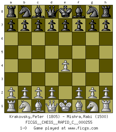 Last move : 1-0 2021 February 26 10:37:18 [Event "FICGS__CHESS__RAPID_C__000255"] [Site "FICGS"] [Date "2021.01.26"] [Round "1"] [White "Krakovsky,Peter"] [Black "Mishra,Rabi"] [Result "1-0"] [WhiteElo "1805"] [BlackElo "1500"] 1.e4 1-0 This chess game has been lost on time (started : 2021.01.26 13:54:42) King's pawn Opening Player White won this chess game. Follow this game move after move (download)It's just you and your opponent at the board and you're trying to prove something. (Bobby Fischer) Korrekt heißt in Deutschland die Haltung eines Mannes, dessen Benehmen nach dem Urteile seiner Nachbarn seiner Stellung angemessen ist. Um korrekt zu sein, muß man sich der Meinung der anderen anpassen... (Emanuel Lasker) El Ajedrez detiene a su maestro dentro de sus propios vínculos, encadenando la mente y el cerebro, por lo que la libertad interior del mas fuerte debe sufrir. (Albert Einstein) Le moment que je préfère le plus dans une rencontre, c'est celui où je sens que la personnalité de l'adversaire se brise. (Robert Fischer) Programming can only do so much before it becomes too much. (Don Groves)