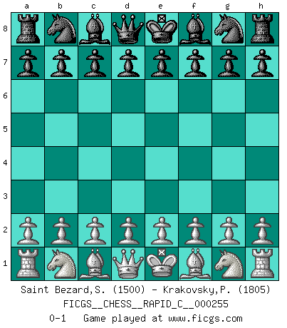 Last move : 0-1 2021 February 25 21:40:51 [Event "FICGS__CHESS__RAPID_C__000255"] [Site "FICGS"] [Date "2021.01.26"] [Round "1"] [White "Saint Bezard,Simon"] [Black "Krakovsky,Peter"] [Result "0-1"] [WhiteElo "1500"] [BlackElo "1805"] 0-1 This chess game has been lost on time (started : 2021.01.26 13:54:42) Player Black won this chess game. Follow this game move after move (download)Kasparov : J'adoube , Ivanchuk : S'il vous plaît ! (Garry Kasparov & Vassily Ivanchuk, Linares 1997) Wenn ich einen Club besuche, sind die Spieler stumm vor Staunen. (José Raúl Capablanca) Cuando le juegas a Fischer, no es una cuestion de si vas a ganar o perder. Es una cuestion de si vas a sobrevivir. (Boris Spassky) Les échecs c'est le défi de l'alpiniste, toujours plus haut, prêt à tout pour monter à l'assaut du Roi ennemi. Les échecs, c'est de la musique en mouvement, un ballet majestueux pour les yeux. C'est de la poésie composée par les fantômes du passé qui au même titre que Rimbaud ou Verlaine méritent notre admiration. Les échecs, c'est de la peinture ou le moindre mouvement modifie le tableau pour en faire un Picasso ou un Van Gogh. Les échecs, c'est tout et rien, c'est la vie et la mort. Jjulie33 sur le forum de France-Echecs. To err is human, to shift the blame on someone else is tactical. (Mladen Jankovic)