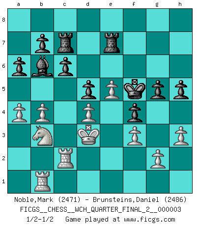 Last move : 1/2-1/2 2007 October 15 14:4:38 [Event "FICGS__CHESS__WCH_QUARTER_FINAL_2__000003"] [Site "FICGS"] [Date "2007.07.11"] [Round "2"] [White "Noble,Mark"] [Black "Brunsteins,Daniel"] [Result "1/2-1/2"] [WhiteElo "2471"] [BlackElo "2486"] 1.e4 c6 2.d4 d5 3.e5 Bf5 4.Nf3 e6 5.Be2 Nd7 6.O-O h6 7.b3 Ne7 8.c4 Ng6 9.Na3 Nf4 10.Bxf4 Bxa3 11.Bd3 Bg4 12.Rb1 Be7 13.h3 Bh5 14.Qe2 O-O 15.Qe3 Bg6 16.Bxg6 fxg6 17.Qd2 g5 18.Be3 Qe8 19.cxd5 exd5 20.Ne1 Qg6 21.Nd3 Rf7 22.f3 a6 23.Qe2 Nf8 24.b4 Ne6 25.a4 h5 26.Nf2 Nf4 27.Bxf4 gxf4 28.Nd3 Re8 29.Rb3 Bd8 30.Nc5 Bb6 31.Rc1 Rc7 32.Qc2 Qxc2 33.Rxc2 g5 34.Kf2 Kf7 35.Rb1 Kg6 36.Ke2 Kf5 37.Kd3 R8e7 38.Nb3 1/2-1/2 Caro-Kann : Advance variation Kingside Castling by player White (move 6) Kingside Castling by player Black (move 14) This chess game ended in a draw. Follow this game move after move (download)There's never before been a Chess player with such a thorough knowledge of the intricacies of the game and such an absolutely indomitable will to win. I think Bobby is the greatest player that ever lived. (Lisa Lane) Dass jemand wie Surab Asmaiparaschwili, der selbst Elopunkte gekauft hat , Vize-Präsident der Fide werden konnte, sagt schon einges über den Zustand dieser Organisation aus. (Joel Lautier) Cuando la partida de Ajedrez termina, el Peón y el Rey regresan a la misma caja. (Irish saying) Le système Elo représente seulement une moyenne. Il est simplement un indicateur de votre stabilité. (Anatoli Karpov) The weakness of an artist is dogma. (Josh Waitzkin)