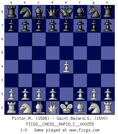 Last move : 1-0 2021 February 26 10:37:18 [Event "FICGS__CHESS__RAPID_C__000255"] [Site "FICGS"] [Date "2021.01.26"] [Round "1"] [White "Pintor,Manuel"] [Black "Saint Bezard,Simon"] [Result "1-0"] [WhiteElo "1588"] [BlackElo "1500"] 1.e4 1-0 This chess game has been lost on time (started : 2021.01.26 13:54:42) King's pawn Opening Player White won this chess game. Follow this game move after move (download)Do you realize Fischer almost never has any bad pieces? He exchanges them, and the bad pieces remain with his opponents. (Yuri Balashov) Die Elozahlen sind sehr schlecht für das Schach. Jetzt ist Schach eine Sportindustrie, die darauf zielt Elopunkte zu machen. (Miguel Najdorf) Aquel que toma al Peón de Caballo de la Reina, se pasará la noche a dormir en la calle. (Anónimo) On n'a jamais que l'âge auquel on a commence à jouer aux échecs car après on cesse de vieillir. (Capablanca) I find television to be very educating. Every time somebody turns on the set, I go in the other room and read a book. (Groucho Marx)