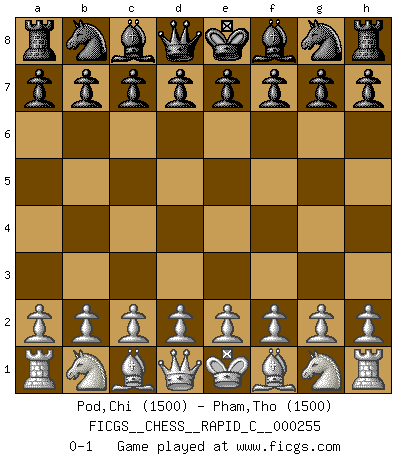 Last move : 0-1 2021 February 25 21:40:51 [Event "FICGS__CHESS__RAPID_C__000255"] [Site "FICGS"] [Date "2021.01.26"] [Round "1"] [White "Pod,Chi"] [Black "Pham,Tho"] [Result "0-1"] [WhiteElo "1500"] [BlackElo "1500"] 0-1 This chess game has been lost on time (started : 2021.01.26 13:54:42) Player Black won this chess game. Follow this game move after move (download)The battle for the ultimate truth will never be won. And that's why Chess is so fascinating. (Hans Kmoch) Die starken Figuren des Gegners muss man abtauschen. (José Raúl Capablanca) Fischer no está bajo la obligación de nadie. (Joseph Platz) Si rien de grave n'est détecté lors de l'analyse d'une position, on joue alors le coup. Seconde règle de Blumenfeld. Beta. Software undergoes beta testing shortly before it's released. Beta is latin for still doesn't work. (Anonymous)