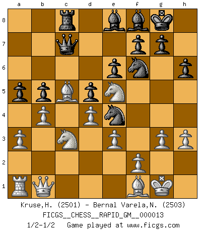 Last move : 1/2-1/2 2021 May 13 13:12:44 [Event "FICGS__CHESS__RAPID_GM__000013"] [Site "FICGS"] [Date "2021.01.30"] [Round "1"] [White "Kruse,Herbert"] [Black "Bernal Varela,Nelson"] [Result "1/2-1/2"] [WhiteElo "2501"] [BlackElo "2503"] 1.d4 e6 2.c4 d5 3.g3 Nf6 4.Nf3 Bb4+ 5.Bd2 Be7 6.Bg2 c6 7.Qc2 O-O 8.O-O b6 9.Bf4 Nbd7 10.cxd5 cxd5 11.Rc1 Bb7 12.Bc7 Qe8 13.Qb3 Ne4 14.Nc3 Ndf6 15.Nb5 a6 16.Nc3 b5 17.Ba5 Ng4 18.Nd1 Nd6 19.a3 h6 20.Qc3 Rc8 21.Qe1 Rxc1 22.Rxc1 Qa8 23.Bb4 Rc8 24.Nc3 Bc6 25.b3 Bf8 26.h3 Nf6 27.Ne5 a5 28.Bc5 Be8 29.e3 Qb8 30.b4 Qc7 31.Ra1 Rd8 32.Bf1 Ra8 33.Bg2 Rd8 34.Bf1 Rc8 35.Qb1 Nde4 1/2-1/2 Queen's pawn Kingside Castling by player Black (move 7) Kingside Castling by player White (move 8) This chess game ended in a draw. Follow this game move after move (download)I don't believe in psychology. I believe in good moves. (Bobby Fischer) Im Spitzenschach von heute geht es nur um Vorbereitung, um tiefgründige, sorgfältige Eröffnungsvorbereitung. (Nigel Short) En la vida, como en el Ajedrez, los Peones propios obstruyen nuestro camino. La gran fortuna de un hombre, su comodidad, placer, hijos, libros, que deberían ayudarle a ganar, con mucha frecuencia lo ponen en Jaque Mate. (Charles Buxton) La tactique est l'élément le plus important du milieu de jeu. (Siegbert Tarrasch) Over-the-board chess is the favorite of mortals, correspondence chess is the favorite of the gods. (Eduard Dyckhoff)