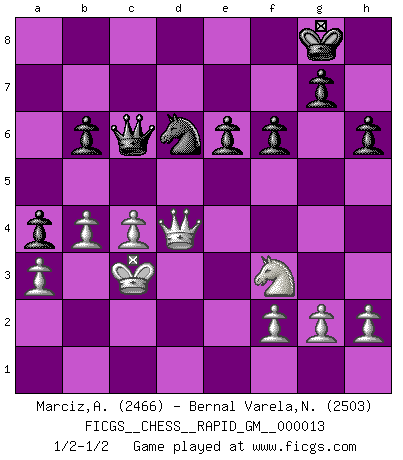 Last move : 1/2-1/2 2021 April 4 7:28:28 [Event "FICGS__CHESS__RAPID_GM__000013"] [Site "FICGS"] [Date "2021.01.30"] [Round "1"] [White "Marciz,Alexander"] [Black "Bernal Varela,Nelson"] [Result "1/2-1/2"] [WhiteElo "2466"] [BlackElo "2503"] 1.e4 e6 2.d4 d5 3.Nc3 Nf6 4.Bg5 dxe4 5.Nxe4 Be7 6.Nxf6+ Bxf6 7.Bxf6 Qxf6 8.Nf3 c5 9.Bb5+ Bd7 10.Qe2 O-O 11.O-O-O Rc8 12.dxc5 Bxb5 13.Qxb5 Na6 14.Rd4 Nxc5 15.Re1 h6 16.Qe2 Rd8 17.Red1 Rac8 18.Rxd8+ Rxd8 19.Rxd8+ Qxd8 20.Qc4 Qb6 21.Qd4 Qb5 22.b3 b6 23.Kb2 f6 24.Qd8+ Kh7 25.c4 Qc6 26.b4 Nb7 27.Qd4 Kg8 28.Kb3 a5 29.a3 a4+ 30.Kc3 Nd6 1/2-1/2 French : Burn variation Kingside Castling by player Black (move 10) Queenside Castling by player White (move 11) This chess game ended in a draw. Follow this game move after move (download)Different people feel differently about resigning. (Bobby Fischer) Als er Schachweltmeister wurde ließ er praktisch alle stärksten Sovietspieler für sich arbeiten. Wenn ein auch nur mittelmässiger Meister ein Spezialist für eine bestimmte Eröffnung war, wurde er von Karpov gerufen. Das wurde alles geheim gehalten. (Mikhail Moiseyevich Botvinik) No hay precio que sea tan grande por la cabellera del Rey enemigo. (Koblentz) La solitude du joueur d'Echecs à l'approche du mat est semblable à celle du condamné. (Francis Szpiner) Happy endings are just stories that haven't finished yet. (Jane Smith in Mr & Mrs Smith)