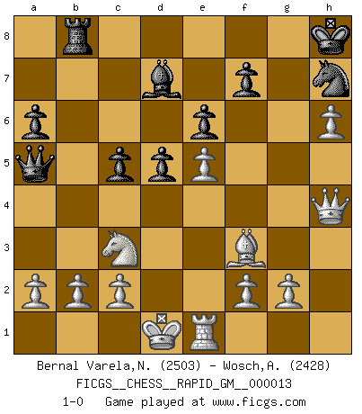 Last move : 1-0 2021 May 24 13:11:35 [Event "FICGS__CHESS__RAPID_GM__000013"] [Site "FICGS"] [Date "2021.01.30"] [Round "1"] [White "Bernal Varela,Nelson"] [Black "Wosch,Arkadiusz"] [Result "1-0"] [WhiteElo "2503"] [BlackElo "2428"] 1.e4 c5 2.Nf3 Nc6 3.d4 cxd4 4.Nxd4 Nf6 5.Nc3 d6 6.Bg5 e6 7.Qd2 a6 8.O-O-O h6 9.Nxc6 bxc6 10.Bf4 d5 11.Qe3 Bb4 12.Be2 O-O 13.e5 Nd7 14.Qg3 Qc7 15.Na4 Re8 16.Bh5 Rb8 17.Bxh6 Bf8 18.Rhe1 Nf6 19.Bf3 Nh7 20.Rd4 c5 21.Rg4 g6 22.Bd2 Bd7 23.Nc3 Rb4 24.h4 Kh8 25.h5 g5 26.Rxg5 Bh6 27.Rg4 Rxg4 28.Qxg4 Rg8 29.Qh4 Bxd2+ 30.Kxd2 Qa5 31.Kd1 Rb8 32.h6 1-0 Sicilian defense Queenside Castling by player White (move 8) Kingside Castling by player Black (move 12) Player White won this chess game. Follow this game move after move (download)Chess is mental torture. (Garry Kasparov) Ohne Leiden bildet sich kein Charakter. (Ernst Freiherr von Feuchtersleben) Bendita sea la memoria de aquel que dio al mundo este juego inmortal. (A. G. Gardiner) D'abord les bases : Jouez et étudiez, puis étudiez et jouez, ensuite jouez et étudiez, puis étudiez et jouez. Deuxièmement : Donnez toujours le meilleur de vous-même ! (Ken Smith) The bottom line is always the bottom line. (Johann Piek)