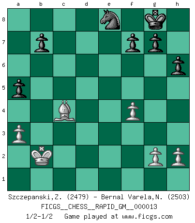 Last move : 1/2-1/2 2021 April 4 16:30:27 [Event "FICGS__CHESS__RAPID_GM__000013"] [Site "FICGS"] [Date "2021.01.30"] [Round "1"] [White "Szczepanski,Zbigniew"] [Black "Bernal Varela,Nelson"] [Result "1/2-1/2"] [WhiteElo "2479"] [BlackElo "2503"] 1.c4 e6 2.Nc3 d5 3.d4 c6 4.e4 dxe4 5.Nxe4 Bb4+ 6.Nc3 e5 7.Be3 exd4 8.Qxd4 Qxd4 9.Bxd4 Nf6 10.O-O-O Be6 11.a3 Be7 12.Nf3 Nbd7 13.Kc2 h6 14.Be2 Nc5 15.b4 Ncd7 16.Rhe1 a5 17.Kb3 c5 18.bxc5 O-O 19.Ne5 Nxc5+ 20.Ka2 Rac8 21.f4 Bd6 22.Kb2 Rfe8 23.Nb5 Bb8 24.Bxc5 Rxc5 25.Nd6 Bxd6 26.Rxd6 Bxc4 27.Nxc4 Rxc4 28.Bxc4 Rxe1 29.Rd8+ Re8 30.Rxe8+ Nxe8 1/2-1/2 English Opening Queenside Castling by player White (move 10) Kingside Castling by player Black (move 18) This chess game ended in a draw. Follow this game move after move (download)I believe that Chess possesses a magic that is also a help in advanced age. A rheumatic knee is forgotten during a game of Chess and other events can seem quite unimportant in comparison with a catastrophe on the chessboard. (Vlastimil Hort) Je mehr wir mit Computern analysieren, desto mehr glauben wir an Verteidigung. (Vladimir Kramnik) Bobby Fischer es el mas grande genio de Ajedrez de todos los tiempos. (Alexander Kotov) Les Echecs sont et restent toujours un combat, un combat intégral comme la boxe, la lutte ou un autre sport, et où il doit y avoir un vainqueur et un vaincu. (Joseph Emil Diemer) History is the quarrels of popes and kings, with wars or pestilences in every page; the men all so good for nothing, and hardly any women at all. (Jane Austen)