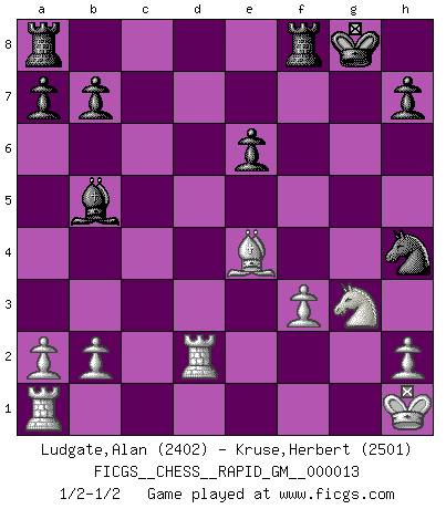 Last move : 1/2-1/2 2021 February 16 12:53:55 [Event "FICGS__CHESS__RAPID_GM__000013"] [Site "FICGS"] [Date "2021.01.30"] [Round "1"] [White "Ludgate,Alan"] [Black "Kruse,Herbert"] [Result "1/2-1/2"] [WhiteElo "2402"] [BlackElo "2501"] 1.d4 Nf6 2.c4 e6 3.Nc3 Bb4 4.Qc2 O-O 5.e4 d5 6.e5 Ne4 7.Bd3 c5 8.Nge2 cxd4 9.Nxd4 Nd7 10.Bf4 Qh4 11.g3 Qh5 12.O-O g5 13.cxd5 gxf4 14.dxe6 fxe6 15.Nxe4 Nxe5 16.f3 fxg3 17.Nxg3 Qh6 18.Be4 Qd2 19.Qxd2 Bxd2 20.Kh1 Ng6 21.Nb5 Bd7 22.Rfd1 Bxb5 23.Rxd2 Nh4 1/2-1/2 Nimzo-Indian : Classical variation Kingside Castling by player Black (move 4) Kingside Castling by player White (move 12) This chess game ended in a draw. Follow this game move after move (download)Chess, like love, like music, has the power to make people happy. (Siegbert Tarrasch) Als ich elf wurde, wurde ich einfach gut. (Robert James Fischer) Fischer no está bajo la obligación de nadie. (Joseph Platz) Les échecs, c'est la lutte contre l'erreur. (Johannes Zukertort) I don't believe in psychology. I believe in good moves. (Bobby Fischer)