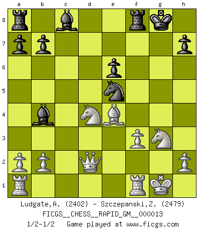 Last move : 1/2-1/2 2021 February 6 8:52:39 [Event "FICGS__CHESS__RAPID_GM__000013"] [Site "FICGS"] [Date "2021.01.30"] [Round "1"] [White "Ludgate,Alan"] [Black "Szczepanski,Zbigniew"] [Result "1/2-1/2"] [WhiteElo "2402"] [BlackElo "2479"] 1.d4 Nf6 2.c4 e6 3.Nc3 Bb4 4.Qc2 O-O 5.e4 d5 6.e5 Ne4 7.Bd3 c5 8.Nge2 cxd4 9.Nxd4 Nd7 10.Bf4 Qh4 11.g3 Qh5 12.O-O g5 13.cxd5 gxf4 14.dxe6 Nxe5 15.Nxe4 fxe6 16.f3 fxg3 17.Nxg3 Qh6 18.Be4 Qd2 19.Qxd2 1/2-1/2 Nimzo-Indian : Classical variation Kingside Castling by player Black (move 4) Kingside Castling by player White (move 12) This chess game ended in a draw. Follow this game move after move (download)When you absolutely don't know what to do anymore, it is time to panic. (John van der Wiel) Der Vorposten provoziert a) eine Basis für neue Angriffe und b) eine Schwächung der gegnerischen Widerstandskraft in der fraglichen Linie. (Aaron Nimzowitsch) Es el objetivo de la escuela moderna no tratar cada posición de acuerdo a una regla general, sino de acuerdo al principio inherente en la posición. (Richard Reti) Mais l'homme est une créature légère et illogique : semblable au joueur d'échecs, il n'aime que le processus du but à atteindre, non le but lui-même. (Dostoïevsky) Two beer, or not two beer. (Unknown)
