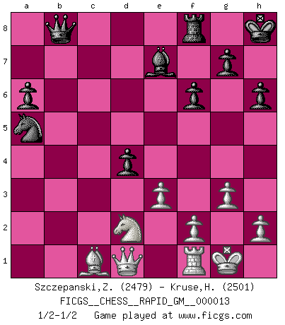 Last move : 1/2-1/2 2021 February 25 12:20:34 [Event "FICGS__CHESS__RAPID_GM__000013"] [Site "FICGS"] [Date "2021.01.30"] [Round "1"] [White "Szczepanski,Zbigniew"] [Black "Kruse,Herbert"] [Result "1/2-1/2"] [WhiteElo "2479"] [BlackElo "2501"] 1.c4 e5 2.Nc3 Nf6 3.Nf3 Nc6 4.g3 d5 5.cxd5 Nxd5 6.Bg2 Nb6 7.a3 Be7 8.b4 Be6 9.Rb1 f6 10.b5 Nd4 11.e3 Nxf3+ 12.Bxf3 Rb8 13.O-O Bf5 14.Rb3 O-O 15.d4 Kh8 16.a4 a5 17.bxa6 bxa6 18.Bg2 c6 19.a5 Nc4 20.Rxb8 Qxb8 21.Bxc6 Nxa5 22.Be4 Bxe4 23.Nxe4 h6 24.Nd2 exd4 1/2-1/2 English Opening Kingside Castling by player White (move 13) Kingside Castling by player Black (move 14) This chess game ended in a draw. Follow this game move after move (download)Live, lose, and learn, by observing your opponent how to win. (Amber Steenbock) Die Jungen erwarten, dass Opa einfach umfällt. Dann aber kann Opa fünf Stunden lang Schach spielen und die jungen Gegner an die Wand drücken. (Viktor Kortschnoi) Un mal plan es mejor que no tener ningún plan. (Frank Marshall) On a dit que l'homme se distingue de l'animal par le fait qu'il achète plus de livres qu'il ne peut en lire. Je voudrais suggérer qu'inclure à la liste des livres quelques livres d'échecs rendrait la distinction manifeste. (Edward Lasker) It's only after you lost everything, Tyler says, that you're free to do anything. (Chuck Palahniuk, Fight Club)