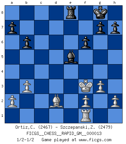 Last move : 1/2-1/2 2021 February 16 15:37:22 [Event "FICGS__CHESS__RAPID_GM__000013"] [Site "FICGS"] [Date "2021.01.30"] [Round "1"] [White "Ortiz,Clodomiro"] [Black "Szczepanski,Zbigniew"] [Result "1/2-1/2"] [WhiteElo "2467"] [BlackElo "2479"] 1.d4 Nf6 2.c4 e6 3.Nf3 b6 4.g3 Ba6 5.b3 d5 6.Bg2 Bb4+ 7.Bd2 Be7 8.cxd5 exd5 9.O-O O-O 10.Nc3 Nbd7 11.Ne5 Bb7 12.Rc1 Re8 13.Rc2 c6 14.e4 dxe4 15.Nxe4 Nxe4 16.Bxe4 Nxe5 17.dxe5 Bd6 18.Bxc6 Bxc6 19.Rxc6 Bxe5 20.Rc4 Rc8 21.Rxc8 Qxc8 22.Qf3 Qa8 23.Kg2 Qxf3+ 24.Kxf3 f6 1/2-1/2 Queen's Indian : Nimzovich variation (exaggerated Fianchetto) Kingside Castling by player White (move 9) Kingside Castling by player Black (move 9) This chess game ended in a draw. Follow this game move after move (download)Help your pieces so they can help you. (Paul Morphy) Wenn du auf das Glück wartest, wird das Leben ziemlich langweilig. (Mikhail Nekhemyevich Tal) Juega la Apertura como un libro, el Juego Medio como un mago y los Finales como una máquina. (Spielmann) Il n'y a pas eu de défaite parce que je ne crois pas que cet ordinateur ait jamais existé. IBM a triché en refusant d'imprimer les modes de recherche de la machine. C'est évident, pendant le match, des coups décisifs ont été joués par des êtres humains. Aujourd'hui, les meilleurs spécialistes en informatique ne peuvent toujours pas expliquer comment Deep-Blue a pu jouer contre la logique des ordinateurs. IBM a gagné une guerre de communication, mais ils sont incapables de prouver que l'ordinateur a gagné tout seul. (Garry Kasparov) The greatest con, that he ever pulled... was making you believe... that he is you. (Revolver, movie)