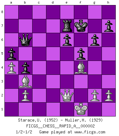 Last move : 1/2-1/2 2006 July 10 10:33:53 [Event "FICGS__CHESS__RAPID_A__000002"] [Site "FICGS"] [Date "2006.06.23"] [Round "1"] [White "Starace,Umberto"] [Black "Muller,Henri-Louis"] [Result "1/2-1/2"] [WhiteElo "1952"] [BlackElo "1929"] 1.e4 c5 2.Nf3 d6 3.d4 cxd4 4.Nxd4 Nf6 5.Nc3 a6 6.Bc4 e6 7.O-O b5 8.Bb3 Be7 9.f4 O-O 10.e5 dxe5 11.fxe5 Nfd7 12.Be3 Nxe5 13.Qh5 Nbc6 14.Nxc6 Nxc6 15.Rf3 g6 16.Qh6 f5 17.Rd1 Qe8 18.Nd5 Qf7 19.Rh3 Rd8 20.Nxe7+ Qxe7 21.Rxd8+ Nxd8 22.Bg5 Qa7+ 23.Kf1 a5 24.Qh4 Ba6 25.Rd3 b4 26.Bxd8 Bxd3+ 27.cxd3 Qd7 28.Bg5 Qxd3+ 29.Kf2 Qd6 30.Qc4 Kf7 31.a4 Re8 32.Bf4 Qb6+ 33.Kf1 Re7 34.Qe2 1/2-1/2 Sicilian : Najdorf, Lipnitzky attack Kingside Castling by player White (move 7) Kingside Castling by player Black (move 9) This chess game ended in a draw. Follow this game move after move (download)There just isn't enough televised Chess. (David Letterman) Drei Punkte vor allen anderen ist wie einer, der im weißen Anzug posiert, während der Rest in Müllsäcke gekleidet dasteht. (Viktor Kortschnoi) Por tratar de evitar la pérdida de una pieza, muchas personas han perdido una partida de Ajedrez. (Savielly Tartakover) C'est une question de caractère, Beaucoup de gens perdent leur motivation très vite. D'autres, ils sont rares, peuvent la conserver très longtemps. J'aime les échecs, encore aujourd'hui je suis heureux d'analyser des parties. J'aime toujours gagner, je déteste encore perdre. Bien jouer est important pour mon intégrité intellectuelle et morale. Et puis les échecs vivent en ce moment une période historique grâce à Internet. Ils se développent dans les systèmes éducatifs à travers le monde. Ils sortent de leur ghetto, et c'est mon rôle de mener à bien cette révolution. (Gary Kasparov) The real voyage of discovery consists not in seeking new lands but in seeing with new eyes. (Marcel Proust)