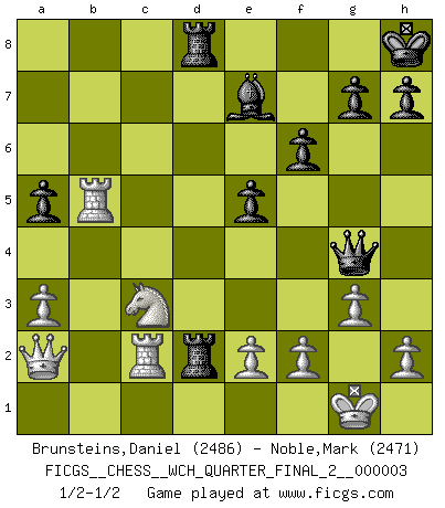 Last move : 1/2-1/2 2007 September 19 7:22:14 [Event "FICGS__CHESS__WCH_QUARTER_FINAL_2__000003"] [Site "FICGS"] [Date "2007.07.11"] [Round "7"] [White "Brunsteins,Daniel"] [Black "Noble,Mark"] [Result "1/2-1/2"] [WhiteElo "2486"] [BlackElo "2471"] 1.c4 e5 2.Nc3 Nf6 3.g3 d5 4.cxd5 Nxd5 5.Bg2 Nb6 6.Nf3 Nc6 7.O-O Be7 8.a3 O-O 9.b4 Be6 10.Rb1 f6 11.d3 Nd4 12.Bb2 Nxf3+ 13.Bxf3 c6 14.Qc2 a5 15.b5 cxb5 16.Nxb5 Rc8 17.Bc3 Nd5 18.Qb2 Nxc3 19.Nxc3 Qd7 20.Bxb7 Rc7 21.Ba6 Qc6 22.Bc4 Bxc4 23.dxc4 Qxc4 24.Nb5 Rd7 25.Rfc1 Qg4 26.Qa2+ Kh8 27.Nc3 Rfd8 28.Rb5 Rd2 29.Rc2 1/2-1/2 English : Bremen, reverse Dragon Kingside Castling by player White (move 7) Kingside Castling by player Black (move 8) This chess game ended in a draw. Follow this game move after move (download)It is difficult to play against Einstein's theory --on his first loss to Fischer. (Mikhail Tal) Die FIDE ist dabei in die Hände der russischen Mafia zu fallen. (Larry Evans) Te sientas frente a un tablero y repentinamente tu corazón brinca. Tu mano tiembla al tomar una pieza y moverla. Pero lo que el Ajedrez te enseña es que tu debes permanecer ahí con calma y pensar de que si realmente es una buena idea o de que si hay otras ideas mejores. (Stanley Kubrick) Ce n'est pas pour s'amuser qu'il joue aux échecs : il célèbre un culte. (Vladimir Nabokov) If you ain't just a little scared when you enter a casino, you are either very rich or you haven't studied the games enough. (Pappy)