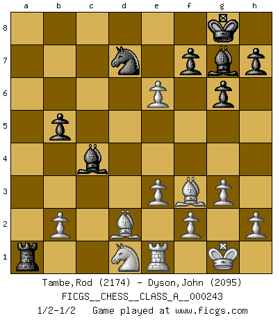 Last move : 1/2-1/2 2021 June 16 4:38:36 [Event "FICGS__CHESS__CLASS_A__000243"] [Site "FICGS"] [Date "2021.01.30"] [Round "1"] [White "Tambe,Rod"] [Black "Dyson,John"] [Result "1/2-1/2"] [WhiteElo "2174"] [BlackElo "2095"] 1.d4 d5 2.c4 c6 3.g3 Nf6 4.Nf3 Bg4 5.Qb3 Qb6 6.Ne5 Be6 7.Nc3 g6 8.e3 Bg7 9.Na4 Qxb3 10.axb3 Nbd7 11.Nxd7 Nxd7 12.Nc3 dxc4 13.bxc4 O-O 14.Bd2 a6 15.Be2 b5 16.Bf3 Rfc8 17.cxb5 axb5 18.Rxa8 Rxa8 19.Bxc6 Ra1+ 20.Nd1 Bb3 21.O-O Nb8 22.Bf3 e5 23.dxe5 Bc4 24.Re1 Nd7 25.e6 1/2-1/2 QGD Slav defense Kingside Castling by player Black (move 13) Kingside Castling by player White (move 21) This chess game ended in a draw. Follow this game move after move (download)A bad day of Chess is better than any good day at work. (Anonymous) Jeder Fehler erscheint unglaublich dumm, wenn andre ihn begehen. (Georg Christoph Lichtenberg) Un mal día en el Ajedrez, es mejor que cualquier buen día en el trabajo. (Anonymous) La guerre est enfant de la passion, la passion est enfant du narcissisme et le narcissisme est l'enfant. (...) Une autre partie ? (Thibault de Vassal) Gambling is the son of avarice and the father of despair. (French proverb)