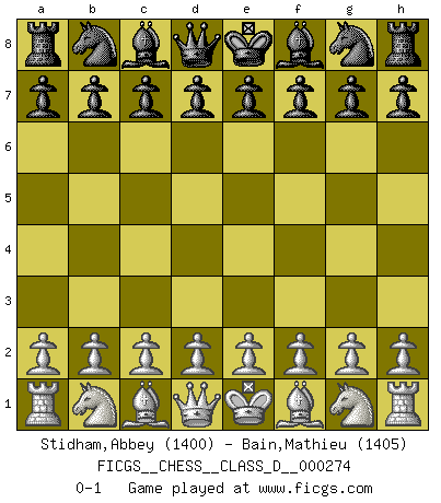 Last move : 0-1 2021 March 13 2:3:49 [Event "FICGS__CHESS__CLASS_D__000274"] [Site "FICGS"] [Date "2021.01.31"] [Round "1"] [White "Stidham,Abbey"] [Black "Bain,Mathieu"] [Result "0-1"] [WhiteElo "1400"] [BlackElo "1405"] 0-1 This chess game has been lost on time (started : 2021.01.31 18:45:14) Player Black won this chess game. Follow this game move after move (download)I play correspondence chess because it is both art and science while chess is art only. (A player at FICGS) Die Jungen erwarten, dass Opa einfach umfällt. Dann aber kann Opa fünf Stunden lang Schach spielen und die jungen Gegner an die Wand drücken. (Viktor Kortschnoi) Los libros de Ajedrez deben de usarse igual como usamos los anteojos: para mejorar la vista, aunque algunos jugadores los quieren usar como si ellos les otorgaran la vision. (José Raúl Capablanca) Les échecs c'est le défi de l'alpiniste, toujours plus haut, prêt à tout pour monter à l'assaut du Roi ennemi. Les échecs, c'est de la musique en mouvement, un ballet majestueux pour les yeux. C'est de la poésie composée par les fantômes du passé qui au même titre que Rimbaud ou Verlaine méritent notre admiration. Les échecs, c'est de la peinture ou le moindre mouvement modifie le tableau pour en faire un Picasso ou un Van Gogh. Les échecs, c'est tout et rien, c'est la vie et la mort. Jjulie33 sur le forum de France-Echecs. I don't diet. I just don't eat as much as I'd like to. (Linda Evangelista, supermodel)
