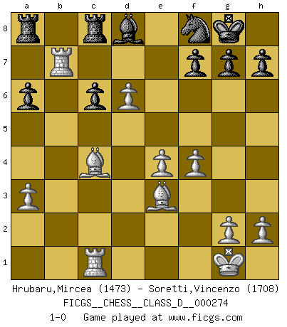 Last move : 1-0 2021 March 9 18:28:26 [Event "FICGS__CHESS__CLASS_D__000274"] [Site "FICGS"] [Date "2021.01.31"] [Round "1"] [White "Hrubaru,Mircea"] [Black "Soretti,Vincenzo"] [Result "1-0"] [WhiteElo "1473"] [BlackElo "1708"] 1.d4 Nf6 2.Nf3 e6 3.c4 Bb4+ 4.Nbd2 O-O 5.a3 Be7 6.e4 d6 7.Qc2 Nc6 8.Be2 b6 9.Nb1 Bb7 10.O-O Nd7 11.Nc3 Bf6 12.Rd1 Qe8 13.Be3 a6 14.b4 e5 15.d5 Ne7 16.Na4 Ng6 17.c5 bxc5 18.bxc5 dxc5 19.Nxc5 Nxc5 20.Qxc5 Nf4 21.Bf1 Qd7 22.Rdc1 Rfc8 23.Rab1 c6 24.d6 Ne6 25.Nxe5 Nxc5 26.Nxd7 Nxd7 27.Rxb7 Nf8 28.f4 Bd8 29.Bc4 1-0 Queen's pawn game Kingside Castling by player Black (move 4) Kingside Castling by player White (move 10) Player White won this chess game. Follow this game move after move (download)Chess makes man wiser and clear-sighted. (Vladimir Putin) Es ist peinlich, dass ich nie Weltmeister wurde. Es wäre leicht, Leonid Breschnjew als Ursache vorzuschieben, dessen Apparat den Vorzeigekommunisten Anatoli Karpow in allem unterstützte. Aber Garri Kasparow zum Beispiel, der ebenfalls von den Sowjets unerwünscht war, hat trotz der Widerstände den WM-Titel erobert. (Viktor Kortschnoi) Yo no le temo a Spassky. Todos saben que yo soy el mejor. Uno no necesita un torneo para probarlo. (Bobby Fischer) La victoire dans une partie d'Echecs appartient la plupart du temps à celui qui voit un peu plus loin que l'adversaire. (Lasker) Now be brave and don't look back. Don't look back. (Shmi Skywalker in Star Wars ep.1)