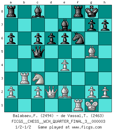 Last move : 1/2-1/2 2007 August 3 6:52:56 [Event "FICGS__CHESS__WCH_QUARTER_FINAL_3__000003"] [Site "FICGS"] [Date "2007.07.11"] [Round "1"] [White "Balabaev,Farit"] [Black "de Vassal,Thibault"] [Result "1/2-1/2"] [WhiteElo "2494"] [BlackElo "2463"] 1.e4 c5 2.Nf3 d6 3.d4 cxd4 4.Nxd4 Nf6 5.Nc3 a6 6.Bg5 e6 7.f4 Qb6 8.Qd2 Qxb2 9.Rb1 Qa3 10.f5 Nc6 11.fxe6 fxe6 12.Nxc6 bxc6 13.Be2 Be7 14.O-O O-O 15.Rb3 Qc5+ 1/2-1/2 Sicilian : Najdorf, 7...Qb6 Kingside Castling by player White (move 14) Kingside Castling by player Black (move 14) This chess game ended in a draw. Follow this game move after move (download)He who takes the Queen's Knight's Pawn will sleep in the streets. (Anonymous) Ich könnte leicht behaupten: Ja,ja, Leonid Breschnew wollte nicht, daß ich Weltmeister werde. In der Tat war die Sache komplizierter. (Viktor Kortschnoi) ¿Porque tengo que perder ante este idiota?. (Aron Nimzovich) Si le désir cupide (et stupide) de gagner est une inépuisable source de souffrance, une combinaison brillante sur l'échiquier est une découverte : le coquelicot qui s'épanouit lorsque apparaît la Voie Lactée. (Arrabal) There is a very easy way to return from a casino with a small fortune : go there with a large one. (Jack Yelton)