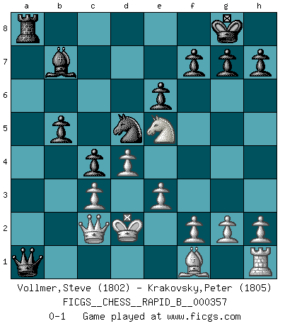 Last move : 0-1 2021 February 14 11:29:21 [Event "FICGS__CHESS__RAPID_B__000357"] [Site "FICGS"] [Date "2021.02.01"] [Round "1"] [White "Vollmer,Steve"] [Black "Krakovsky,Peter"] [Result "0-1"] [WhiteElo "1802"] [BlackElo "1805"] 1.d4 d5 2.c4 c6 3.Nf3 Nf6 4.Bf4 dxc4 5.e3 b5 6.a4 e6 7.axb5 cxb5 8.Bxb8 Rxb8 9.Rxa7 Bb4+ 10.Nc3 Nd5 11.Qc2 Ba5 12.Ne5 O-O 13.Nc6 Bxc3+ 14.bxc3 Qb6 15.Nxb8 Qxa7 16.Nc6 Qa1+ 17.Kd2 Bb7 18.Ne5 Ra8 0-1 QGD Slav : 3.Nf3 Kingside Castling by player Black (move 12) Player Black won this chess game. Follow this game move after move (download)It was clear to me that the vulnerable point of the American Grandmaster (Bobby Fischer) was in double-edged, hanging, irrational positions, where he often failed to find a win even in a won position. (Efim Geller) Je mehr ich von der FIDE weiss, um so weniger verstehe ich. (Alexander Kalifman) Alguna parte de un error es siempre correcto. (Savielly Tartakover) Des points faibles ou des trous dans la position de l'adversaire doivent être occupés par des pièces et non pas par des pions. (Siegbert Tarrasch) Life is painting a picture, not doing a sum. (Oliver Wendell Holmes, Jr.)