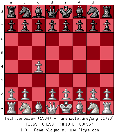 Last move : 1-0 2021 March 5 21:33:43 [Event "FICGS__CHESS__RAPID_B__000357"] [Site "FICGS"] [Date "2021.02.01"] [Round "1"] [White "Pech,Jaroslav"] [Black "Furenzula,Gregory"] [Result "1-0"] [WhiteElo "1904"] [BlackElo "1770"] 1.c4 1-0 This chess game has been lost on time (started : 2021.02.01 11:19:48) English Opening Player White won this chess game. Follow this game move after move (download)You need not play well - just help your opponent to play badly. (Genrikh Chepukaitis) Ich habe kein Problem mit Frauen, sondern nur mit dem Niveau ihres Schachspiels (Judith Polgar) El Ajedrez es de 30 a 40 por ciento psicología. Uno no cuenta con esto cuando se juega contra una computadora. No lo puedo confundir. (Judith Polgar) Le profane ne songe pas à la somme de jouissance dont il se prive, qui méconnaît ce jeu aux ressources aussi variées que passionnantes. (Jean-Marie Jeanton-Lamarche) It is not titles that honor men, but men that honor titles. (Niccolo Machiavelli)