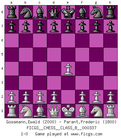 Last move : 1-0 2021 March 19 16:22:18 [Event "FICGS__CHESS__CLASS_B__000337"] [Site "FICGS"] [Date "2021.02.07"] [Round "1"] [White "Gossmann,Ewald"] [Black "Parant,Frederic"] [Result "1-0"] [WhiteElo "2000"] [BlackElo "1800"] 1.e4 1-0 This chess game has been lost on time (started : 2021.02.07 11:39:43) King's pawn Opening Player White won this chess game. Follow this game move after move (download)Chess is like war on a board. (Bobby Fischer) Ich kämpfe solange mein Gegner einen Fehler machen kann. (Emanuel Lasker) Solo existe una cosa que Fischer hace en el Ajedrez sin placer: ¡perder!. (Boris Spassky) Horreur, mais aussi harmonie suprême : qu'y avait-il en effet au monde en dehors des échecs ? Le brouillard, l'inconnu, le non-être... (Vladimir Nabokov) It's not enough to succeed. Others must fail. (Gore Vidal)