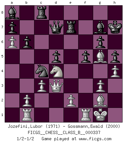 Last move : 1/2-1/2 2021 March 27 14:57:40 [Event "FICGS__CHESS__CLASS_B__000337"] [Site "FICGS"] [Date "2021.02.07"] [Round "1"] [White "Jozefini,Lubor"] [Black "Gossmann,Ewald"] [Result "1/2-1/2"] [WhiteElo "1971"] [BlackElo "2000"] 1.f4 d5 2.Nf3 c5 3.g3 Nc6 4.Bg2 Nf6 5.O-O g6 6.d3 Bg7 7.c3 O-O 8.Ne5 Re8 9.Nd2 Nxe5 10.fxe5 Ng4 11.Nb3 Nxe5 12.Nxc5 b6 13.Nb3 Nc6 14.d4 Bb7 15.Bg5 f6 16.Bf4 e5 17.dxe5 Nxe5 18.Nd4 Rc8 19.Nc2 Qd7 20.a4 f5 21.a5 Nc4 22.a6 Ba8 23.Rb1 h6 24.Qd3 Kh7 25.h4 h5 26.Nd4 Re7 27.Bg5 1/2-1/2 Bird's Opening Kingside Castling by player White (move 5) Kingside Castling by player Black (move 7) This chess game ended in a draw. Follow this game move after move (download)A thorough understanding of the typical mating continuations makes the most complicated sacrificial combinations leading up to them not only not difficult, but almost a matter of course. (Siegbert Tarrasch) Bogoljubow: Matt in vier Zügen! Tartakower: Ich verbitte mir jede Belästigung! (Savielly Grigorievitsch Tartakower) El Ajedrez es tortura mental. (Garry Kasparov) La conception d'un plan est le processus par lequel un joueur exploite les avantages de sa position tout en s'efforçant d'en réduire au minimum les inconvénients. Afin de garantir le succès, un plan doit toujours se fonder sur un diagnostic objectif des particularités d'une position. La conception d'un plan est d'autant plus difficile que la position est équilibrée, et grandement facilitée lorsqu'il n'existe qu'un seul plan susceptible de répondre aux exigences de la position. (Harry Golombek) Mandala - that's it! 16x16 squares as multiple of the four and the eight because of the Four Noble Truths and the Noble Eightfold Path. (Heinz-Georg Lehnhoff about Big Chess)