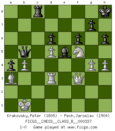 Last move : 1-0 2021 October 5 7:48:57 [Event "FICGS__CHESS__CLASS_B__000337"] [Site "FICGS"] [Date "2021.02.07"] [Round "1"] [White "Krakovsky,Peter"] [Black "Pech,Jaroslav"] [Result "1-0"] [WhiteElo "1805"] [BlackElo "1904"] 1.e4 c5 2.Nf3 d6 3.d4 cxd4 4.Nxd4 Nf6 5.Nc3 a6 6.h3 e5 7.Nb3 Be6 8.Be3 Be7 9.f4 exf4 10.Bxf4 Nc6 11.Qe2 Nd7 12.O-O-O Nce5 13.Kb1 O-O 14.Qe3 Rc8 15.g4 Qc7 16.Nd4 b5 17.Nd5 Bxd5 18.exd5 Nb6 19.Qb3 h6 20.Nf5 Bf6 21.h4 Nec4 22.Bxc4 Nxc4 23.Bc1 Be5 24.Rhe1 a5 25.Re4 a4 26.Qd3 Qd7 27.a3 Rc5 28.Qf3 f6 29.c3 Kh8 30.Re2 Nxa3+ 31.bxa3 Rxc3 32.Rd3 Rc4 33.Rc2 Rxc2 34.Kxc2 Rc8+ 35.Kb1 b4 36.axb4 Qb5 37.Ba3 1-0 This chess game has been lost on time (started : 2021.02.07 11:39:43) Sicilian : Najdorf, Adams attack Queenside Castling by player White (move 12) Kingside Castling by player Black (move 13) Player White won this chess game. Follow this game move after move (download)I won't play with you anymore. You have insulted my friend. - When an opponent cursed himself for a blunder. (Miguel Najdorf) Das Zentrum ist der Balkan des Schachbretts - Kriegshandlungen können in jedem Moment ausbrechen. (Aaron Nimzowitsch) El Ajedrez es un expediente tonto que hace creer a la gente inactiva que hacen una cosa muy astuta cuando solamente estan perdiendo su tiempo. (George Bernard Shaw) Que feriez-vous si vous étiez en train de jouer aux échecs et que la fin du monde arrive ? Je continuerais à jouer. (Saint Borromée) Indecision is the key to flexibility. (Unknown)
