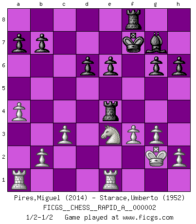 Last move : 1/2-1/2 2006 August 23 20:9:12 [Event "FICGS__CHESS__RAPID_A__000002"] [Site "FICGS"] [Date "2006.06.23"] [Round "1"] [White "Pires,Miguel"] [Black "Starace,Umberto"] [Result "1/2-1/2"] [WhiteElo "2014"] [BlackElo "1952"] 1.e4 c5 2.Nf3 d6 3.Bb5+ Bd7 4.Bxd7+ Qxd7 5.O-O Nc6 6.d4 cxd4 7.Nxd4 Nf6 8.Nc3 g6 9.Nf3 Bg7 10.Bf4 O-O 11.Qe2 Rac8 12.Rfd1 Qe6 13.Ng5 Qg4 14.Qxg4 Nxg4 15.Nd5 h6 16.Nf3 f5 17.exf5 Rxf5 18.Be3 Rcf8 19.c3 Nxe3 20.Nxe3 Rf4 21.a4 Ne5 22.Nxe5 Bxe5 23.Rf1 e6 24.g3 Re4 25.Kg2 Bg7 26.Rfe1 Kf7 27.f3 1/2-1/2 Sicilian : Canal-Sokolsky attack, 3...Bd7 Kingside Castling by player White (move 5) Kingside Castling by player Black (move 10) This chess game ended in a draw. Follow this game move after move (download)Chess is life. (Bobby Fischer) Woher wissen wir, daß der Neanderthaler Blindschach gespielt hat? -- Bei Ausgrabungen wurden keine Schachbretter und Figuren gefunden. (Anonymous) Alekhine es un poeta que crea un trabajo de arte de algo que raramente inspiraría a otra persona a mandar una tarjeta postal. (Max Euwe) Si je n'étais pas joueur d'échecs, je serais le meilleur dans quelque chose d'autre. (Anatoli Karpov) Internet: Absolute communication, absolute isolation. (Paul Carvel)