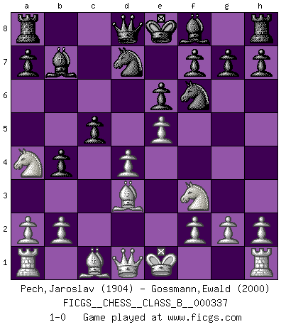 Last move : 1-0 2021 August 1 22:23:59 [Event "FICGS__CHESS__CLASS_B__000337"] [Site "FICGS"] [Date "2021.02.07"] [Round "1"] [White "Pech,Jaroslav"] [Black "Gossmann,Ewald"] [Result "1-0"] [WhiteElo "1904"] [BlackElo "2000"] 1.d4 d5 2.c4 c6 3.Nf3 e6 4.Nc3 Nf6 5.e3 Nbd7 6.Bd3 dxc4 7.Bxc4 b5 8.Bd3 Bb7 9.e4 b4 10.Na4 c5 11.e5 1-0 This chess game has been lost on time (started : 2021.02.07 11:39:43) QGD Slav : 3.Nf3 Player White won this chess game. Follow this game move after move (download)Bobby Fischer is the greatest Chess player who has ever lived. (Ken Smith) Ich würde mich als ganz normalen Jungen bezeichnen [Im Alter von 12]. (Sergej Karjakin) Cuando tengas duda... ¡juega al Ajedrez!. (Tevis) Même un GMI sait rarement calculer sur plus de cinq coups une attaque à sacrifices. (Rudolf Spielmann) Luck never made a man wise. (Seneca, Letters to Lucilius)