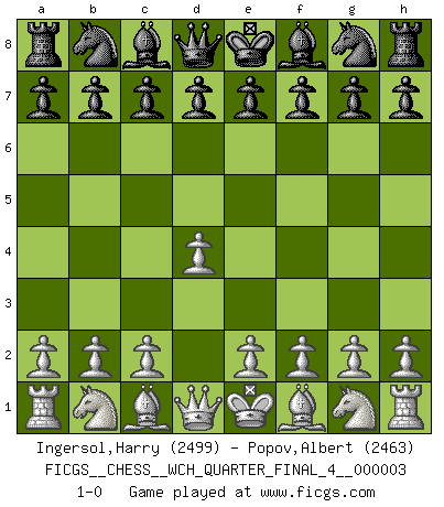 Last move : 1-0 2007 August 11 9:4:3 [Event "FICGS__CHESS__WCH_QUARTER_FINAL_4__000003"] [Site "FICGS"] [Date "2007.07.11"] [Round "1"] [White "Ingersol,Harry"] [Black "Popov,Albert"] [Result "1-0"] [WhiteElo "2499"] [BlackElo "2463"] 1.d4 1-0 This chess game has been lost on time (started : 2007.07.11 17:33:41) Queen's pawn Player White won this chess game. Follow this game move after move (download)Best by test: 1. e4 (Bobby Fischer) Fischer machte Schach einfach zu einer aufregenden Sache, wann immer er sich ans Brett setzte. (Raymond Keene) Vive, pierde y aprende al observar a tu oponente como gana. (Amber Steenbock) RxDa4 pat (...) A woman without a man is like a fish without a bicycle. (Gloria Steinem)