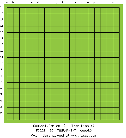Last move : 0-1 2021 March 12 12:57:13 [Event "FICGS__GO__TOURNAMENT__000080"] [Site "FICGS"] [Date "2021.02.10"] [Round "1"] [Black "Coutant,Damien"] [White "Tran,Linh"] [Result "0-1"] 0-1 This go game has been lost on time (started : 2021.02.10 1:9:43) Here are the names of the openings (joseki) played in the four corners : Player White won this Go (weiqi, baduk) game. Follow this game move after move (download)There is damezumari at the bamboo joint. (Anonymous) He who laughs last probably does not get the joke. (Unknown)