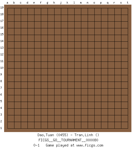 Last move : 0-1 2021 March 12 12:57:13 [Event "FICGS__GO__TOURNAMENT__000080"] [Site "FICGS"] [Date "2021.02.10"] [Round "1"] [Black "Dao,Tuan"] [White "Tran,Linh"] [Result "0-1"] [Rating 1 "0455"] 0-1 This go game has been lost on time (started : 2021.02.10 1:9:43) Here are the names of the openings (joseki) played in the four corners : Player White won this Go (weiqi, baduk) game. Follow this game move after move (download)Eyes win semiais. (Anonymous) There is no instance of a country having benefited from prolonged warfare. (Sun Tzu)