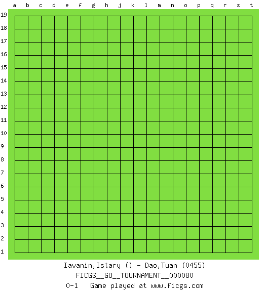 Last move : 0-1 2021 March 12 12:57:13 [Event "FICGS__GO__TOURNAMENT__000080"] [Site "FICGS"] [Date "2021.02.10"] [Round "1"] [Black "Iavanin,Istary"] [White "Dao,Tuan"] [Result "0-1"] [Rating 2 "0455"] 0-1 This go game has been lost on time (started : 2021.02.10 1:9:43) Here are the names of the openings (joseki) played in the four corners : Player White won this Go (weiqi, baduk) game. Follow this game move after move (download)The poor player plays the opponent's game for him. (Anonymous) No, I am still playing. (Anatoly Karpov)