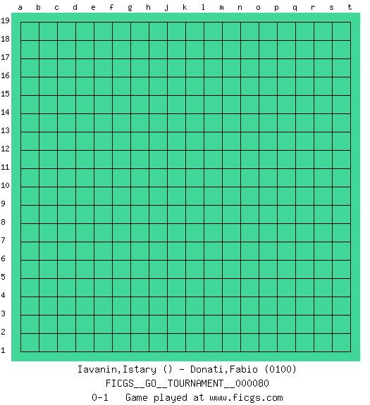 Last move : 0-1 2021 March 12 12:57:13 [Event "FICGS__GO__TOURNAMENT__000080"] [Site "FICGS"] [Date "2021.02.10"] [Round "1"] [Black "Iavanin,Istary"] [White "Donati,Fabio"] [Result "0-1"] [Rating 2 "0100"] 0-1 This go game has been lost on time (started : 2021.02.10 1:9:43) Here are the names of the openings (joseki) played in the four corners : Player White won this Go (weiqi, baduk) game. Follow this game move after move (download)If you cannot succeed, then die gloriously. (Chinese proverb) If passion drives you, let reason holds the reins. (Benjamin Franklin)