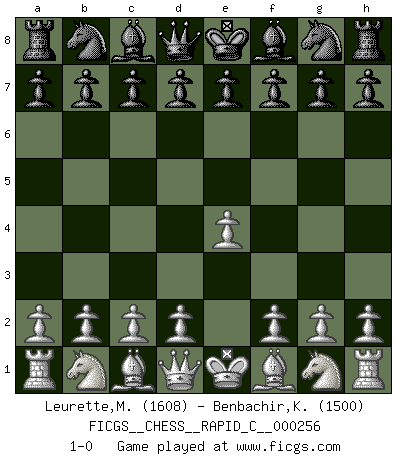 Last move : 1-0 2021 March 12 12:57:13 [Event "FICGS__CHESS__RAPID_C__000256"] [Site "FICGS"] [Date "2021.02.10"] [Round "1"] [White "Leurette,Marc-Antoine"] [Black "Benbachir,Khalid"] [Result "1-0"] [WhiteElo "1608"] [BlackElo "1500"] 1.e4 1-0 This chess game has been lost on time (started : 2021.02.10 1:11:41) King's pawn Opening Player White won this chess game. Follow this game move after move (download)Castle early and often. (Rob Sillars) Ich bewundere Kasparows phantasievolle Angriffssiege aus den Achtzigern und Neunzigern, aber wenn man sie mit dem Computer überprüft, nimmt der Computer in jeder zweiten Partie die Opfer an, verteidigt sich und gewinnt. (Vladimir Kramnik) Personalmente, yo prefiero mirar hacia el futuro en donde un programa de computadora gane el título mundial de Ajedrez. La humanidad necesita una lección de humildad. (Richard Dawkings) Les Echecs sont affaire de jugement sensible. Savoir quand frapper et quand esquiver. (Fischer) Question: Is 'This statement is paradoxical' a paradoxical statement ? Or is it a meta-paradox ? (Normajean Yates)