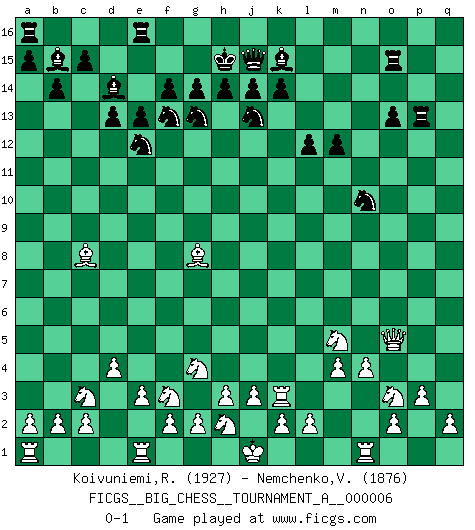 Last move : 0-1 2021 March 17 19:29:51 [Event "FICGS__BIG_CHESS__TOURNAMENT_A__000006"] [Site "FICGS"] [Date "2021.02.11"] [Round "1"] [White "Koivuniemi,Raimo"] [Black "Nemchenko,Valery"] [Result "0-1"] [WhiteElo "1927"] [BlackElo "1876"] 1.d2-d4 b15-b14 2.c1-k8 e15-e13 3.m2-m4 c16-b15 4.p1-o3 p16-o14 5.e2-e3 d15-d13 6.l1-o4 f15-f14 7.n2-n4 l15-l13 8.f1-c4 m15-m13 9.j2-k4 j15-k13 10.o1-g8 b16-d15 11.q1-n1 k15-k14 12.h1-q9 n15-n14 13.q9-n6 d15-c13 14.n6-o7 h15-g13 15.c4-e6 k13-j11 16.e6-b9 c13-e12 17.k8-p13 o16-n15 18.o4-j9 m13-m12 19.o7-o11 l16-k15 20.o11-j11 k16-l14 21.b9-c8 l14-j13 22.g8-e10 h16-j15 23.m1-m3 q15-q14 24.p13-q12 o14-m13 25.q12-j5 f16-e15 26.j11-p5 p15-p13 27.p5-o5 m13-o12 28.g1-f3 e15-d14 29.j9-k8 n14-n13 30.j5-p11 o15-o13 31.m3-k3 j16-h15 32.b1-c3 g15-g14 33.k4-m5 g16-e15 34.h2-g4 e15-f13 35.k1-h2 o12-n10 36.p11-n13 q16-o16 37.n13-p15 o16-o15 38.p15-q14 m16-q16 39.q14-p13 n15-p13 40.k8-p13 q16-p16 41.e10-g8 l13-l12 42.p2-p3 p16-p13 0-1 Follow this game move after move (download)A chess genius has died; a loss for humanity. (Viktor Kortchnoi, about Bobby Fischer's death) Er war ein guter Schachspieler, aber ich kann Leute nicht ausstehen, die 'Heil Hitler' rufen (Über Alexander Aljechin). (Miguel Najdorf) Yo creo que el Ajedrez posee una magia que es también una ayuda en la edad avanzada. Una rodilla reumática es olvidada durante una partida de Ajedrez y otros eventos pueden parecer algo sin importancia comparada a una catástrofe en el tablero de Ajedrez. (Vlastimil Hort) L'attaque fait le spectacle, la défense gagne les matchs. (Dicton footballistique) History is a gallery of pictures in which there are few originals and many copies. (Alexis de Tocqueville)