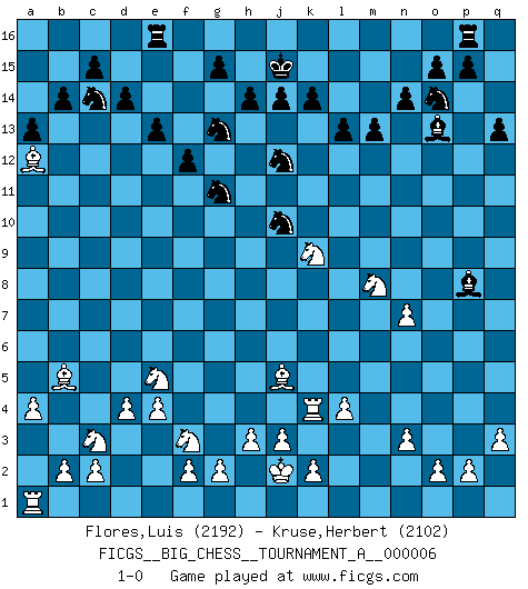 Last move : 1-0 2021 August 16 21:42:40 [Event "FICGS__BIG_CHESS__TOURNAMENT_A__000006"] [Site "FICGS"] [Date "2021.02.11"] [Round "1"] [White "Flores,Luis"] [Black "Kruse,Herbert"] [Result "1-0"] [WhiteElo "2192"] [BlackElo "2102"] 1.j2-k4 h15-g13 2.h2-g4 j15-k13 3.p1-o3 p16-o14 4.b1-c3 b16-c14 5.e2-e4 h16-o10 6.m2-m4 e15-e13 7.f1-b5 g16-j15 8.l1-p5 k16-h15 9.d2-d4 f16-b12 10.h1-p8 m15-m13 11.c1-l9 l16-p12 12.l9-m8 o10-f10 13.k1-h2 d15-d14 14.n2-n3 c16-l8 15.o1-f9 l8-n10 16.p8-p7 n15-n14 17.g1-j2 o16-f8 18.e1-e3 f10-j10 19.j1-k1 j15-h13 20.m4-m5 f8-k12 21.p7-d7 h13-g11 22.f9-e8 k12-j13 23.q2-q3 m16-m14 24.o3-m4 m14-l14 25.e3-f3 f15-f13 26.m4-l6 f13-f12 27.d7-b9 j16-j15 28.a1-e1 j10-h9 29.b9-b7 a15-a13 30.m1-m4 h9-h13 31.e8-d9 h13-p6 32.q1-p1 q16-m16 33.p5-q4 q15-q13 34.q4-p3 a16-a14 35.m4-p4 p6-l10 36.d9-k3 a14-b14 37.b7-j7 b12-c13 38.j7-p13 m16-p16 39.a2-a4 j13-m10 40.p13-q12 b14-b9 41.q12-o10 k15-k14 42.o10-o6 b9-o9 43.o6-m6 c13-h8 44.l6-n7 o9-h9 45.m6-b6 h8-b14 46.f3-f6 l14-l11 47.p4-l4 l10-n8 48.n7-l6 n8-g14 49.m8-g3 g14-b9 50.b6-b9 h9-b9 51.g4-e5 m10-d2 52.e1-a1 b14-h8 53.f6-d6 k13-h12 54.h2-f3 d2-o12 55.j2-h4 h12-j10 56.h4-g6 h8-g9 57.d6-d8 l11-l8 58.d8-l8 n10-l8 59.p1-m1 o12-m14 60.l6-n7 l8-n10 61.k4-l6 g9-h10 62.g3-l7 h10-l7 63.p3-l7 g13-j12 64.m1-m4 b9-p9 65.m4-p4 p9-p4 66.l4-p4 m14-h10 67.l7-j5 l15-l13 68.k1-j2 b15-b14 69.g6-j7 h10-k12 70.l6-m8 n10-m11 71.j7-k9 p12-o13 72.p4-k4 k12-o8 73.m5-m6 h15-g13 74.k3-a12 o8-n7 75.m6-n7 m11-p8 76.l2-l4 1-0 Paul Brand Lyard This game could be finish Paul Brand Lyard gg Follow this game move after move (download)At this time Fischer is simply a level above all the best Chessplayers in the world. (John Jacobs) Jeder Schachmeister war einmal ein Anfänger. (Irving Chernev) Botvinnik trataba de restarle el misterio al Ajedrez, siempre relacionandolo a situaciones de la vida ordinaria. El gustaba de llamar al Ajedrez un típico problema inexacto similar a aquellos de los cuales la gente siempre tiene que enfrentarse en la vida cotidiana. (Garry Kasparov) La solitude du joueur d'Echecs à l'approche du mat est semblable à celle du condamné. (Francis Szpiner) Plans are ideas that never come to fruition. (Daniel Parmet)